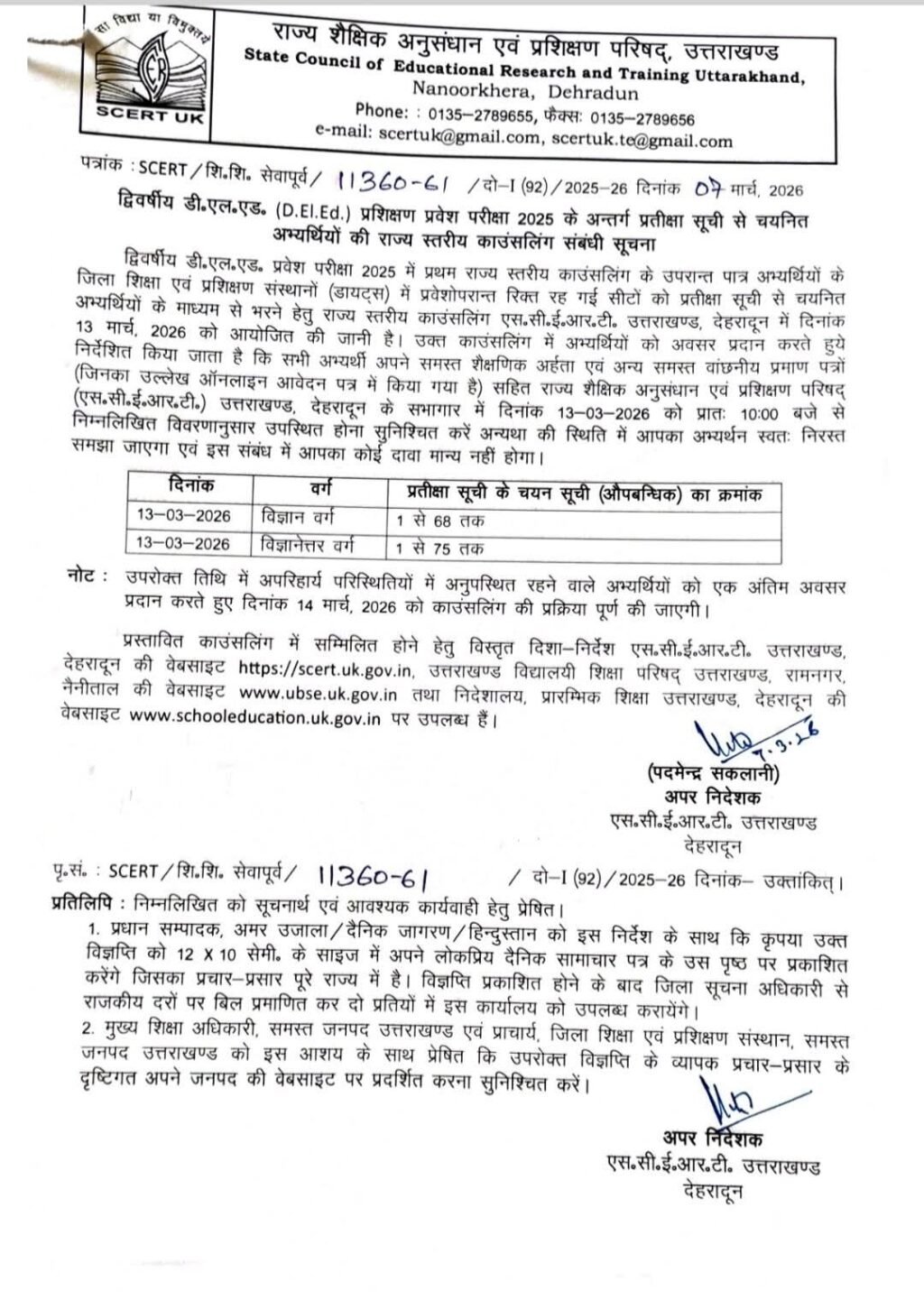 द्विवर्षीय डी.एल.एड. प्रवेश परीक्षा 2025 में प्रथम राज्य स्तरीय काउंसलिंग के उपरान्त पात्र अभ्यर्थियों के जिला शिक्षा एवं प्रशिक्षण संस्थानों (डायट्स) में प्रवेशोपरान्त रिक्त रह गई सीटों को प्रतीक्षा सूची से चयनित अभ्यर्थियों के माध्यम से भरने हेतु राज्य स्तरीय काउंसलिंग एस.सी.ई.आर.टी. उत्तराखण्ड, देहरादून में दिनांक 13 मार्च, 2026 को आयोजित की जानी है। उक्त काउंसलिंग में अभ्यर्थियों को अवसर प्रदान करते हुये निर्देशित किया जाता है कि सभी अभ्यर्थी अपने समस्त शैक्षणिक अर्हता एवं अन्य समस्त वांछनीय प्रमाण पत्रों (जिनका उल्लेख ऑनलाइन आवेदन पत्र में किया गया है) सहित राज्य शैक्षिक अनुसंधान एवं प्रशिक्षण परिषद् (एस.सी.ई.आर.टी.) उत्तराखण्ड, देहरादून के सभागार में दिनांक 13-03-2026 को प्रातः 10:00 बजे से निम्नलिखित विवरणानुसार उपस्थित होना सुनिश्चित करें अन्यथा की स्थिति