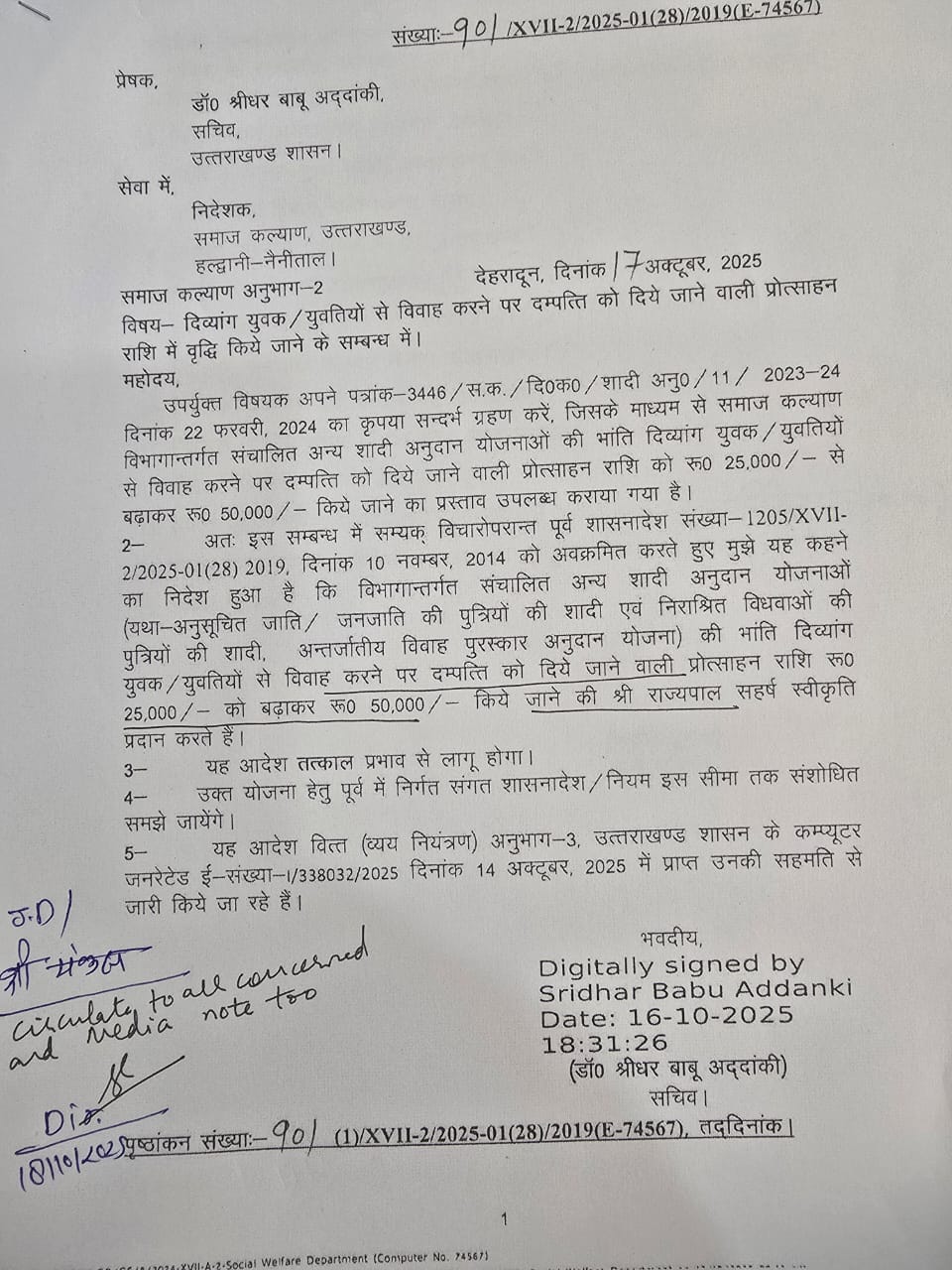 देहरादून- समाज कल्याण विभाग ने दिव्यांग युवक युवतियों के विवाह की प्रोत्साहन राशि को किया दोगुना