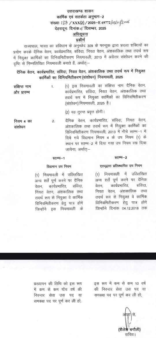 उत्तराखंड: 10 साल सेवा वाले कार्मिक होंगे विनियमित, नियमावली-2025 जारी