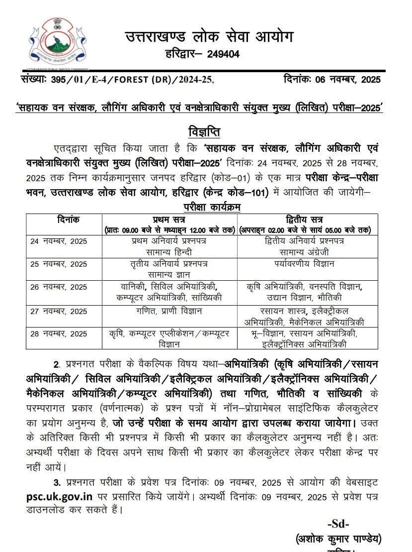 एतद्वारा सूचित किया जाता है कि ‘सहायक वन संरक्षक, लौगिंग अधिकारी एवं वनक्षेत्राधिकारी संयुक्त मुख्य (लिखित) परीक्षा-2025’ दिनांकः 24 नवम्बर, 2025 से 28 नवम्बर, 2025 तक निम्न कार्यक्रमानुसार जनपद हरिद्वार (कोड-01) के एक मात्र परीक्षा केन्द्र-परीक्षा भवन, उत्तराखण्ड लोक सेवा आयोग, हरिद्वार (केन्द्र कोड-101) में आयोजित की जायेगी-