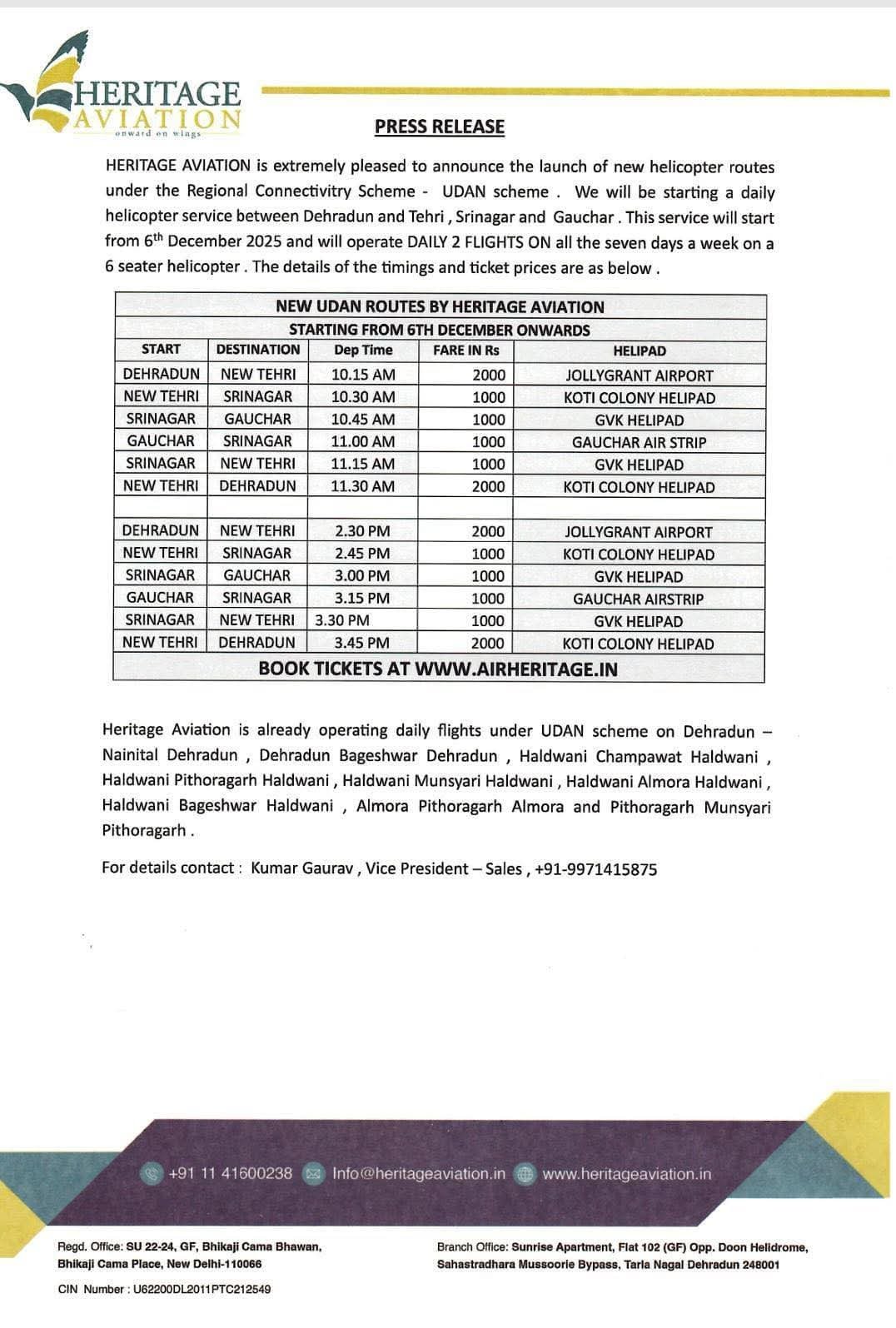 खुशखबरी -एक बार फिर देहरादून से गोचर चमोली तक टिहरी, श्रीनगर उड़ान योजना के तहत हेरिटेज एविएशन (HERITAGE AVIATION) की हेली सेवा कल 6 दिसंबर से शुरू हो रही है। लंबे समय से बंद होने से इमरजेंसी जाने वालों को दिक्कत का सामना करना पड़ रहा था सेवा फिर शुरू होने से लोगों को आसान यात्रा ओर सस्ते में हवाई सेवा का अवसर मिलेगा खासकर इमरजेंसी में जाने वालों के लिए बहुत ही फायदेमंद प्रतिदिन दो बार सुबह और शाम में हेली सेवा चलेगी।टिकट बुक करने के लिए BOOK TICKETS AT WWW.AIRHERITAGE.IN साईट पर जाकर कर सकते हैं।