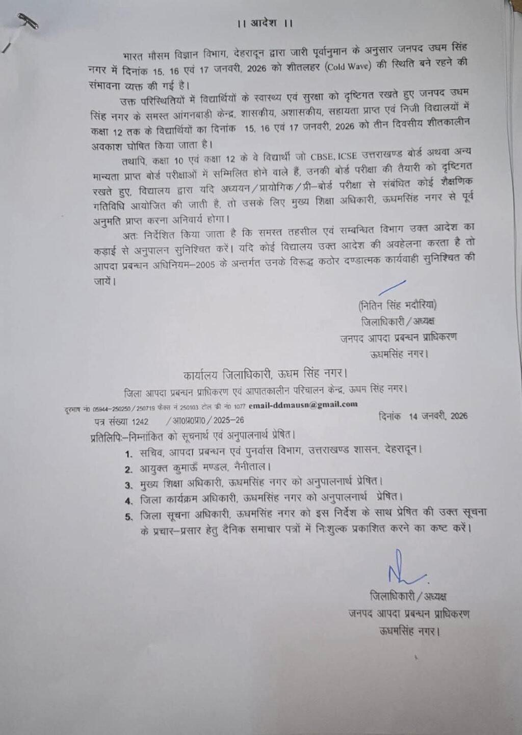 उक्त परिस्थितियों में विद्यार्थियों के स्वास्थ्य एवं सुरक्षा को दृष्टिगत रखते हुए जनपद उधम सिंह नगर के समस्त आंगनबाड़ी केन्द्र, शासकीय, अशासकीय, सहायता प्राप्त एवं निजी विद्यालयों में कक्षा 12 तक के विद्यार्थियों का दिनांक 15. 16 एवं 17 जनवरी, 2026 को तीन दिवसीय शीतकालीन अवकाश घोषित किया जाता है।