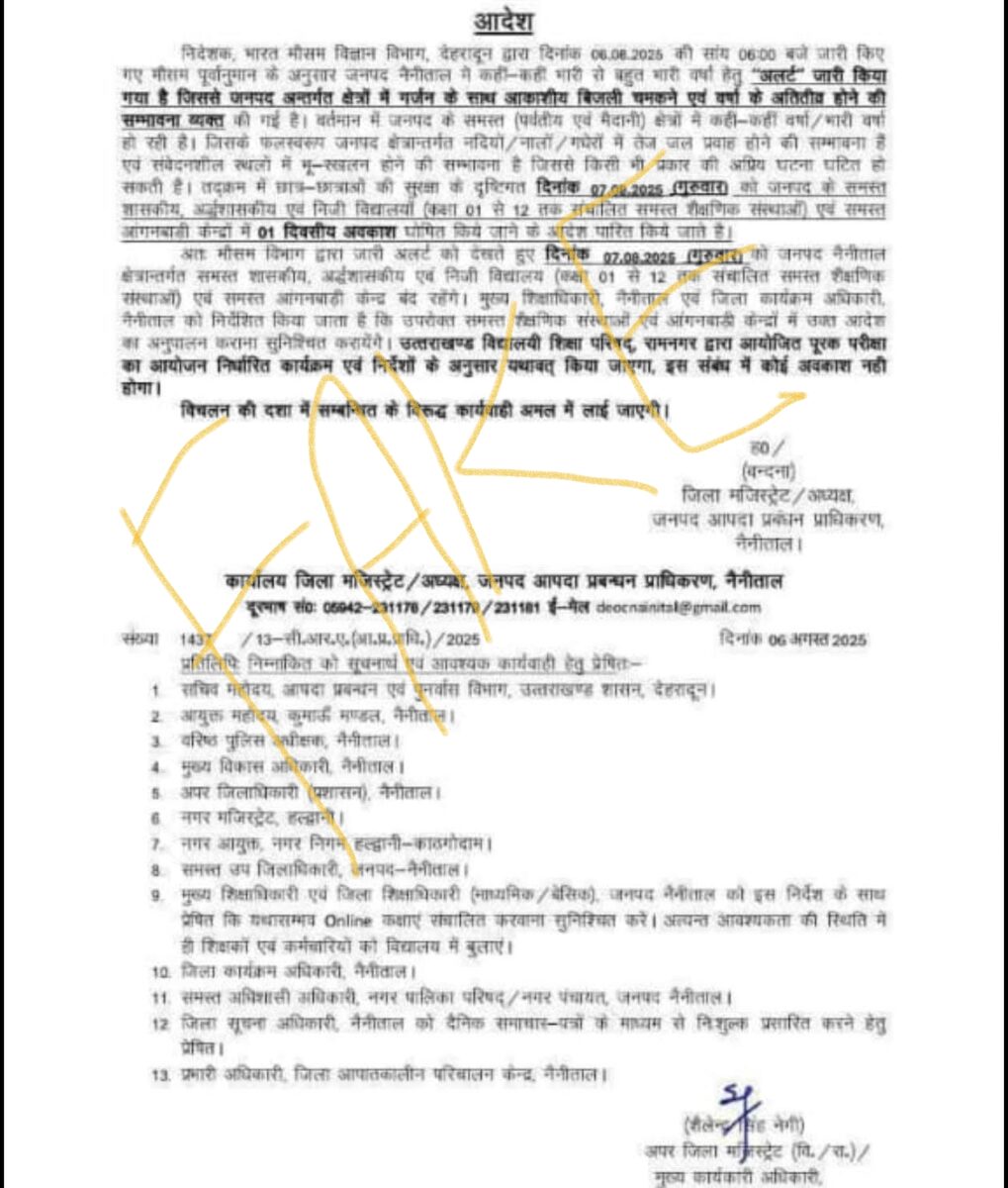 नैनीताल : गुरुवार दिनांक 7 अगस्त 2025 को अवकाश संबंधित एक फर्जी आदेश विभिन्न व्हाट्सएप ग्रुपों में भेजा जा रहा है। जो पूर्णतया गलत है, इस प्रकार का आदेश जिला कार्यालय नैनीताल द्वारा जारी नहीं किया गया है। जो पूर्णतया फर्जी आदेश है।
