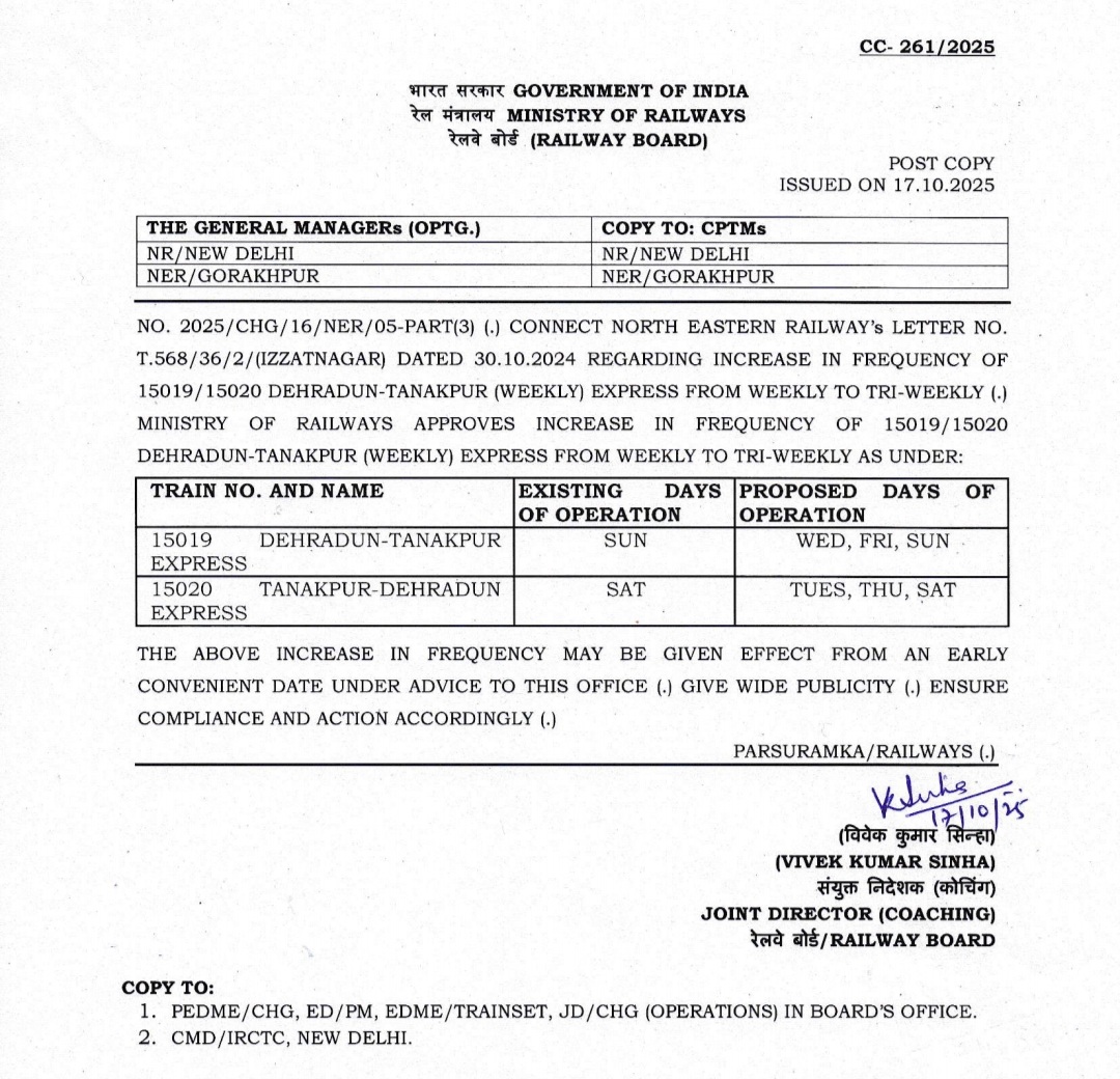 रेल मंत्रालय ने रेलवे बोर्ड के माध्यम से 15019/15020 देहरादून-टनकपुर एक्सप्रेस की सेवा आवृत्ति बढ़ाकर त्रि-साप्ताहिक कर दी है। अब यह ट्रेन बुधवार, शुक्रवार और रविवार को देहरादून से टनकपुर और मंगलवार, गुरुवार व शनिवार को टनकपुर से देहरादून के लिए चलेगी।