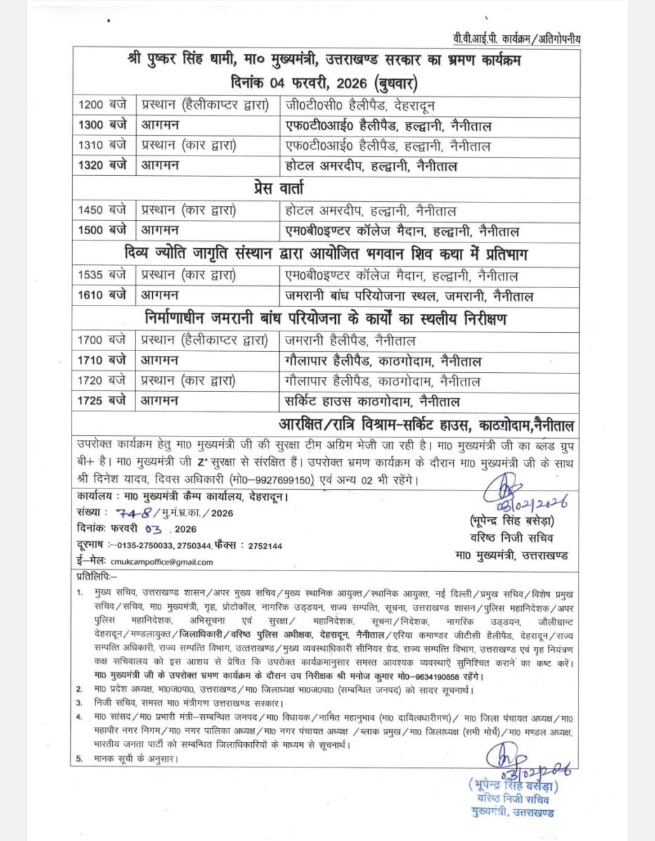 इसके पश्चात दोपहर 1:30 बजे होटल अमरदीप में मुख्यमंत्री मीडिया से संवाद करते हुए प्रेस कॉन्फ्रेंस करेंगे। दोपहर 3 बजे वे एमबी इंटर कॉलेज मैदान में आयोजित शिव कथा कार्यक्रम में प्रतिभाग करेंगे।