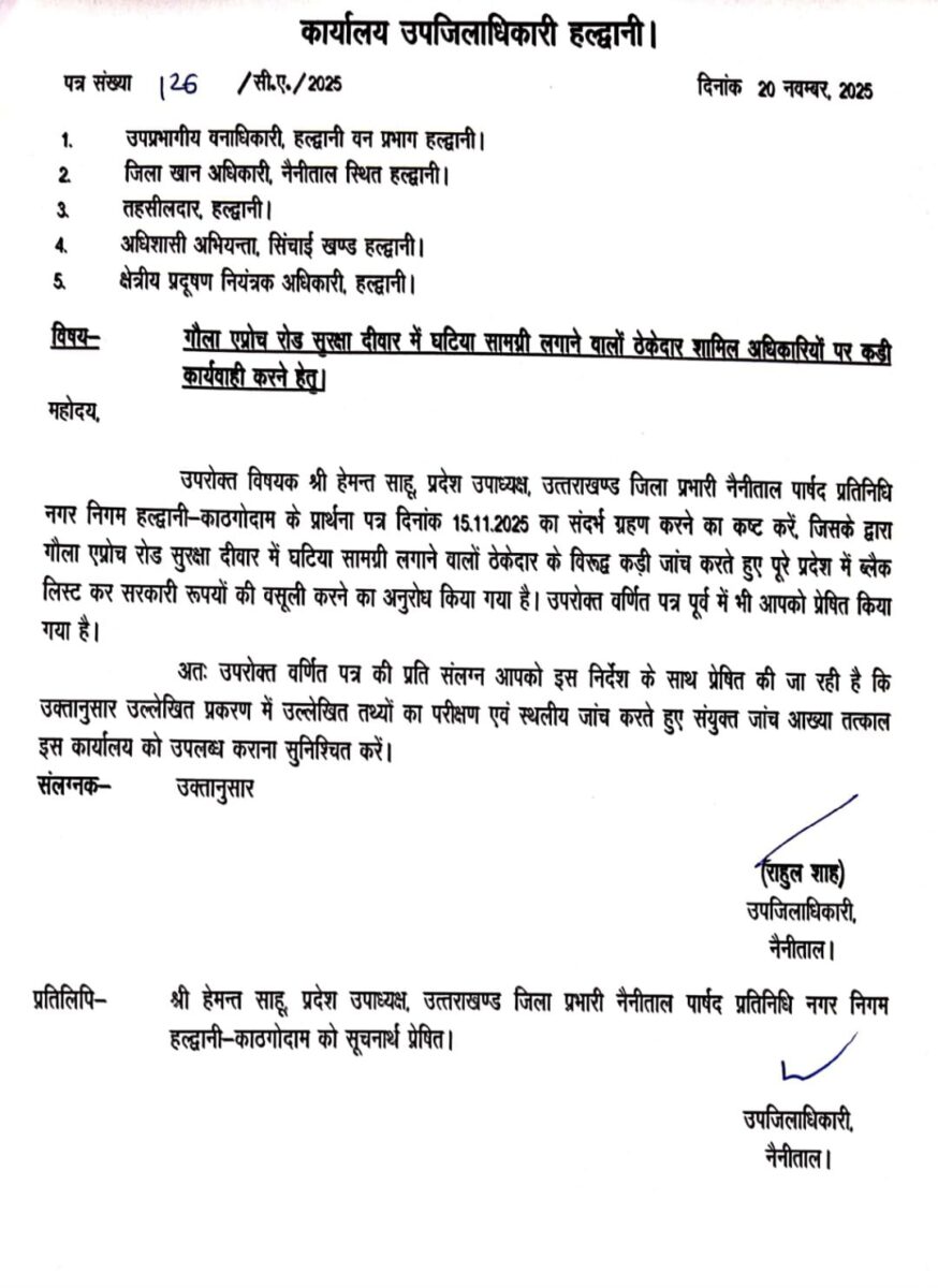 उपरोक्त विषयक श्री हेमन्त साहू, प्रदेश उपाध्यक्ष, उत्तराखण्ड जिला प्रभारी नैनीताल पार्षद प्रतिनिधि नगर निगम हल्द्वानी-काठगोदाम के प्रार्थना पत्र दिनांक 15.11.2025 का संदर्भ ग्रहण करने का कष्ट करें, जिसके द्वारा गौला एप्रोच रोड सुरक्षा दीवार में घटिया सामग्री लगाने वालों ठेकेदार के विरूद्ध कड़ी जांच करते हुए पूरे प्रदेश में ब्लैक लिस्ट कर सरकारी रूपयों की वसूली करने का अनुरोध किया गया है। उपरोक्त वर्णित पत्र पूर्व में भी आपको प्रेषित किया गया है।
