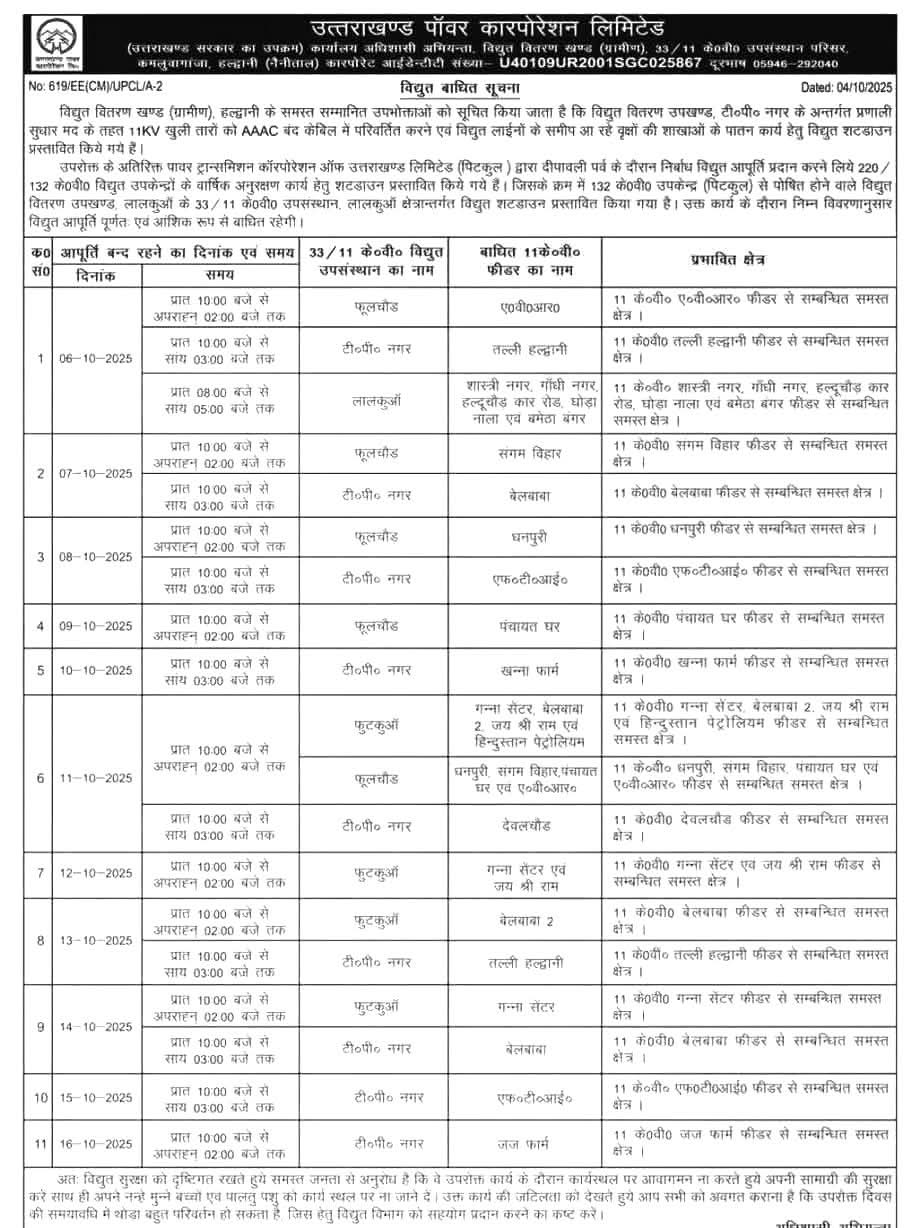 हल्द्वानी में 6 अक्टूबर से 16 अक्टूबर तक बिजली कटौती का शेड्यूल जारी किया गया है। उत्तराखंड पावर कॉर्पोरेशन लिमिटेड (UPCL) ने इस अवधि के दौरान शहर के विभिन्न इलाकों में बिजली आपूर्ति प्रभावित रहने की जानकारी दी है। यह कटौती पुराने तारों और कनेक्शन को हटाकर एरियल बंच केबल (ABC) तकनीक से बदलने के लिए की जा रही है, जिससे भविष्य में बिजली की गुणवत्ता और सुरक्षा में सुधार होगा।