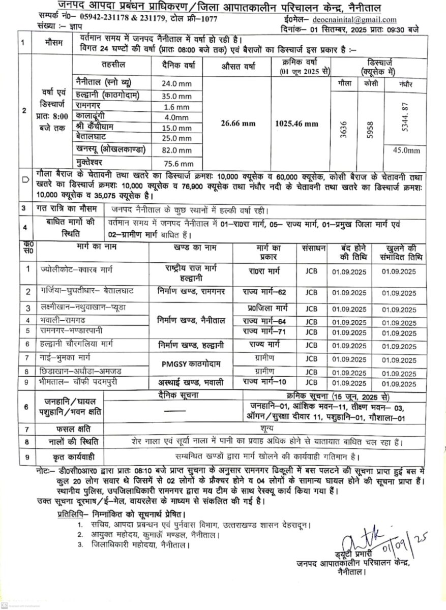 जनपद नैनीताल में लगातार भारी वर्षा हो रही है, जिससे पहाड़ी क्षेत्रों में भूस्खलन (मलवा गिरना) और नदी-नालों में तेज बहाव जैसी घटनाएं बढ़ रही हैं।