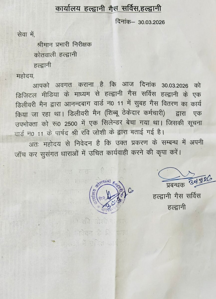 आपको अवगत कराना है कि आज दिनांक 30.03.2026 को डिजिटल मीडिया के माध्यम से हल्द्वानी गैस सर्विस हल्द्वानी के एक डिलीवरी मैन द्वारा आनन्दबाग वार्ड न0 11 में सुबह गैस वितरण का कार्य किया जा रहा था। डिलीवरी मैन (शिब्बू ठेकेदार कर्मचारी) द्वारा एक उपभोक्ता को रू0 2500 में एक सिलेन्डर बेचा गया था। जिसकी सूचना वार्ड न0 11 के पार्षद श्री रवि जोशी के द्वारा बताई गई है।