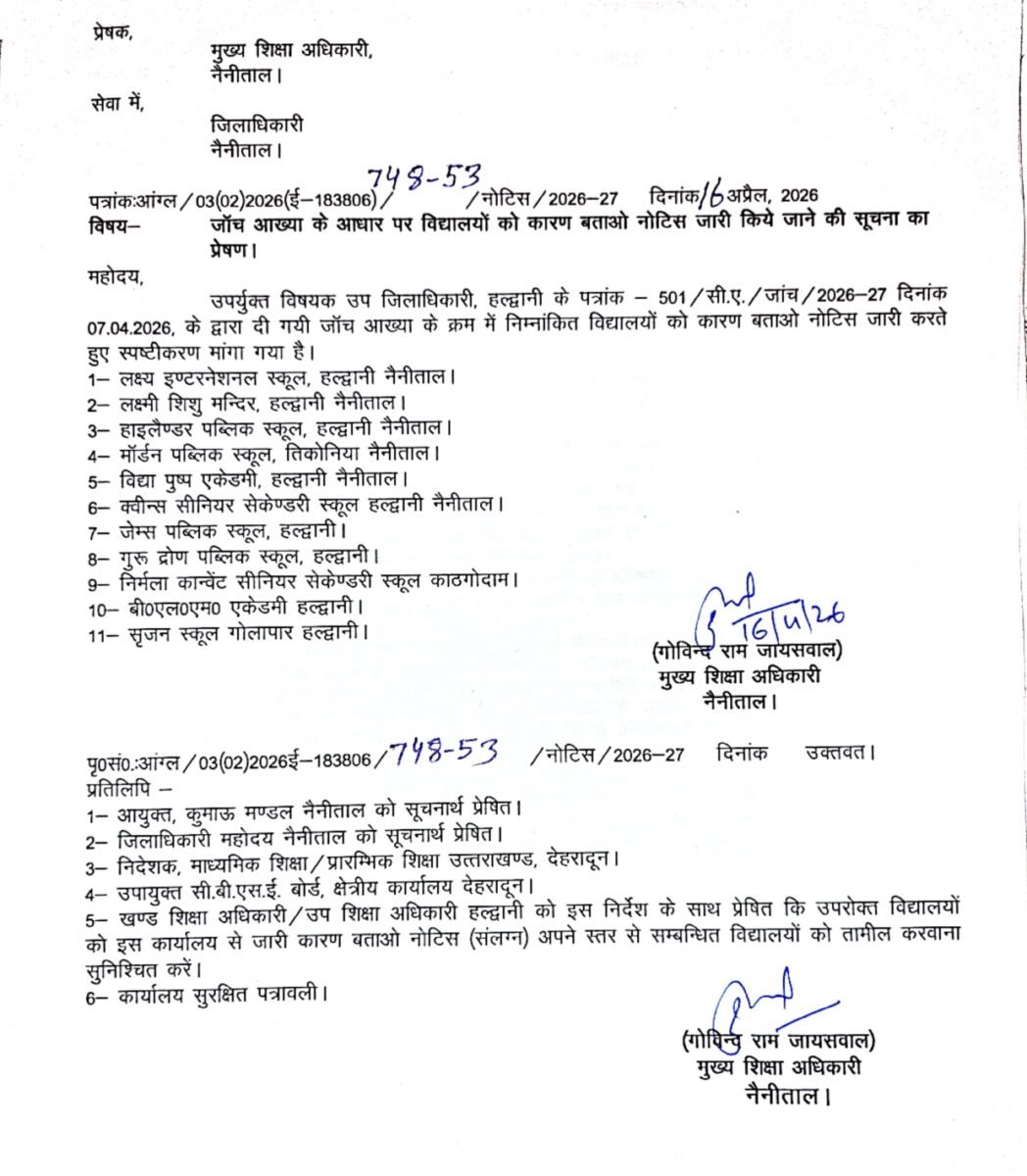 उपर्युक्त विषयक उप जिलाधिकारी, हल्द्वानी के पत्रांक 501/सी.ए./जांच /2026-27 दिनांक 07.04.2026, के द्वारा दी गयी जॉच आख्या के क्रम में निम्नांकित विद्यालयों को कारण बताओ नोटिस जारी करते हुए स्पष्टीकरण मांगा गया है।