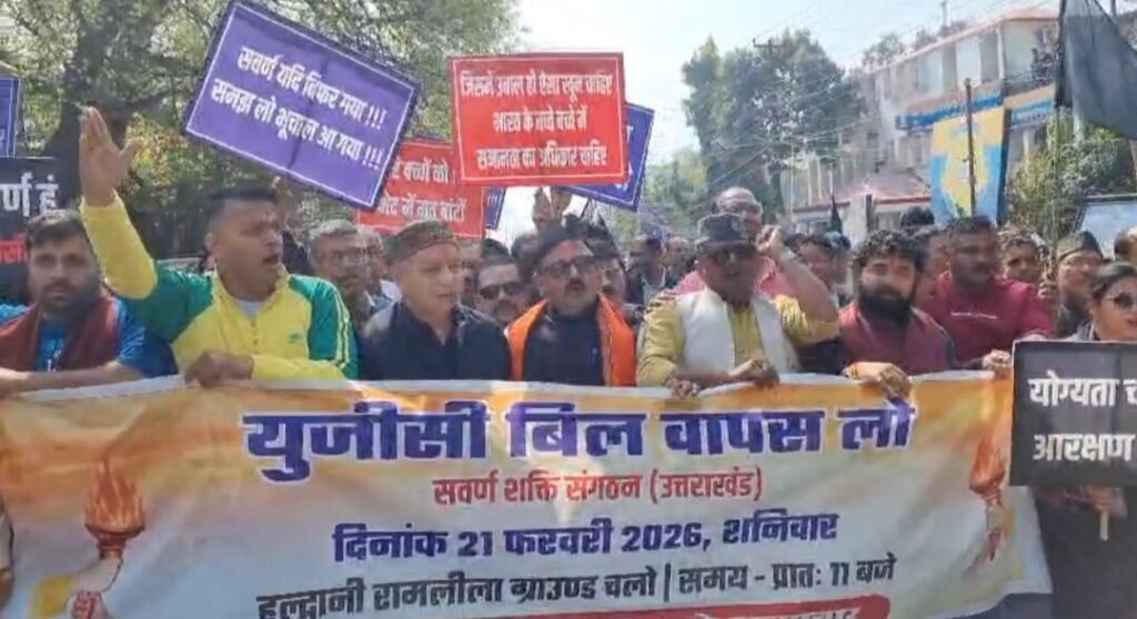 हल्द्वानी : हल्द्वानी में UGC बिल के विरोध में स्वर्ण समाज ने जोरदार प्रदर्शन किया। स्वर्ण शक्ति संगठन के आह्वान पर बड़ी संख्या में लोग रामलीला मैदान में एकत्र हुए, जहां से रैली निकालकर जिलाधिकारी कार्यालय तक जुलूस निकाला गया। रैली का नेतृत्व संगठन के संयोजक प्रकाश हरबोला ने किया। इस दौरान उन्होंने केंद्र सरकार पर निशाना साधते हुए कहा कि UGC बिल स्वर्ण समाज को दबाने की मंशा से लाया गया है। उन्होंने कहा कि यदि सरकार ने बिल वापस नहीं लिया तो आंदोलन को और तेज किया जाएगा रामलीला मैदान से शुरू हुआ जुलूस मुख्य मार्गों से होते हुए जिलाधिकारी कार्यालय पहुंचा। प्रदर्शनकारियों ने नारेबाजी करते हुए अपनी मांगों को जोरदार ढंग से रखा। इस दौरान जिलाधिकारी ललित मोहन रयाल के माध्यम से राष्ट्रपति को ज्ञापन प्रेषित किया गया। ज्ञापन में केंद्र सरकार से तत्काल UGC बिल को वापस लेने की मांग की गई है।