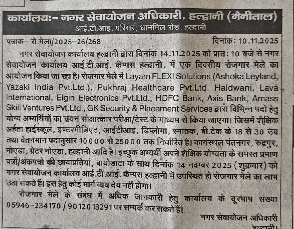 हल्द्वानी: नगर सेवायोजन कार्यालय हल्द्वानी द्वारा दिनांक 14.11.2025 को प्रातः 10 बजे से नगर सेवायोजन कार्यालय आई.टी.आई. कैम्पस हल्द्वानी, में एक दिवसीय रोजगार मेले का आयोजन किया जा रहा है। रोजगार मेले में Layam FLEXI Solutions (Ashoka Leyland, Yazaki India Pvt. Ltd.), Pukhraj Healthcare Pvt.Ltd. Haldwani, Lava International, Elgin Electronics Pvt.Ltd., HDFC Bank, Axis Bank, Amass Skill Ventures Pvt.Ltd., GK Security & Placement Services द्वारा विभिन्न पदों हेतु योग्य अभ्यर्थियों का चयन साक्षात्कार परीक्षा/टेस्ट के माध्यम से किया जाएगा। जिसमें शैक्षिक अर्हता हाईस्कूल, इण्टरमीडिएट, आईटीआई, डिप्लोमा, स्नातक, बी.टेक के 18 से 30 उम्र तथा वेतनमान पदानुसार 10000 से 25000 तक निर्धारित है। कार्यस्थल पंतनगर, रुद्रपुर, नोएडा, ग्रेटर नोएडा, हल्द्वानी आदि हैं। इच्छुक अभ्यर्थी अपने शैक्षिक योग्यता के समस्त प्रमाण पत्रों/अंकपत्रों की छायाप्रतियां, बायोडाटा के साथ दिनांक 14 नवम्बर 2025 (शुक्रवार) को नगर सेवायोजन कार्यालय आई.टी.आई. कैम्पस हल्द्वानी में उपस्थित हो रोजगार मेले का लाभउठा सकते हैं। इस हेतु कोई मार्ग व्यय देय नहीं होगा।