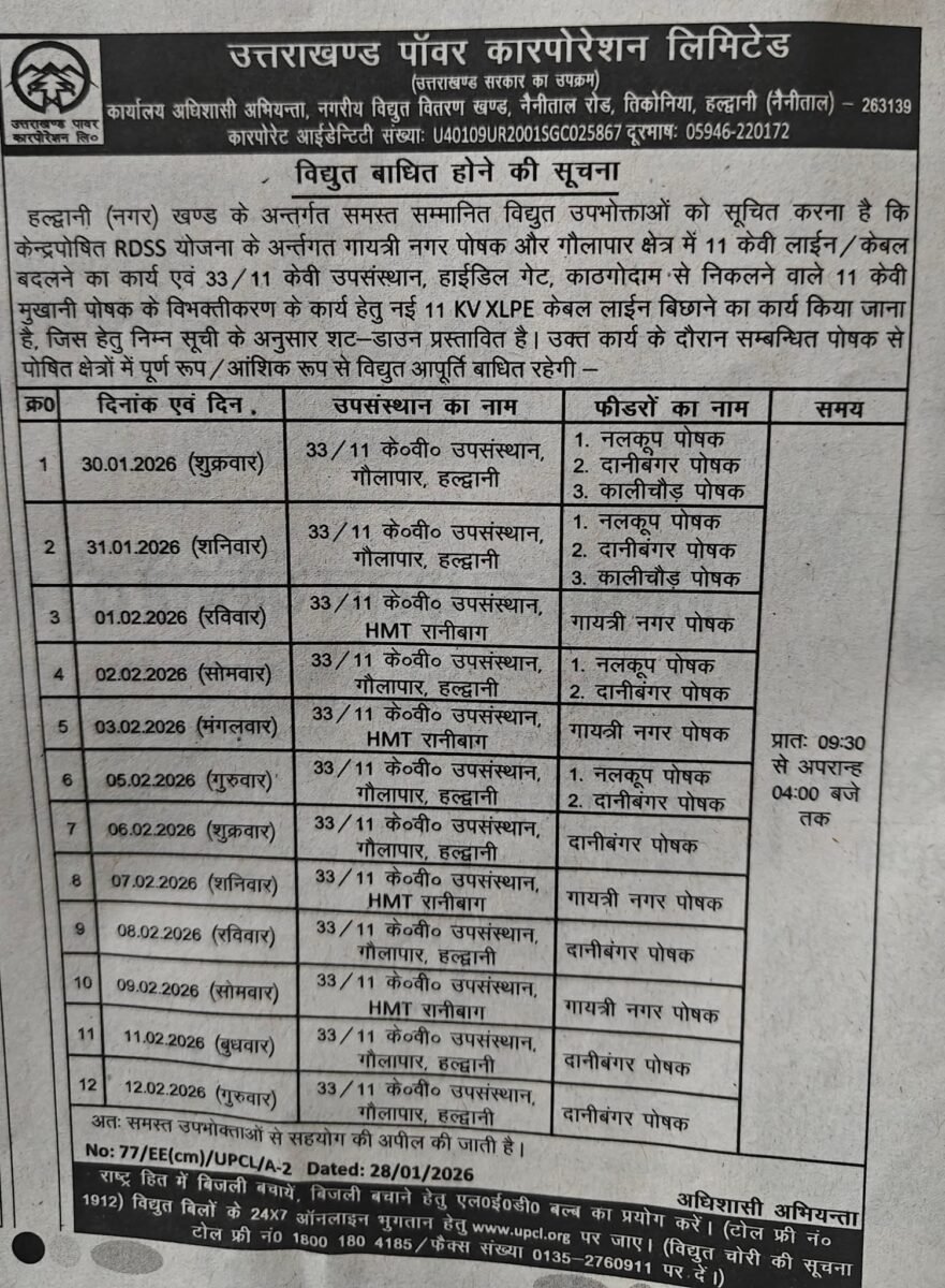 30 जनवरी से 12 फरवरी तक हल्द्वानी के कई इलाकों में गुल रहेगी बिजली। विभाग ने जारी किया रोस्टर