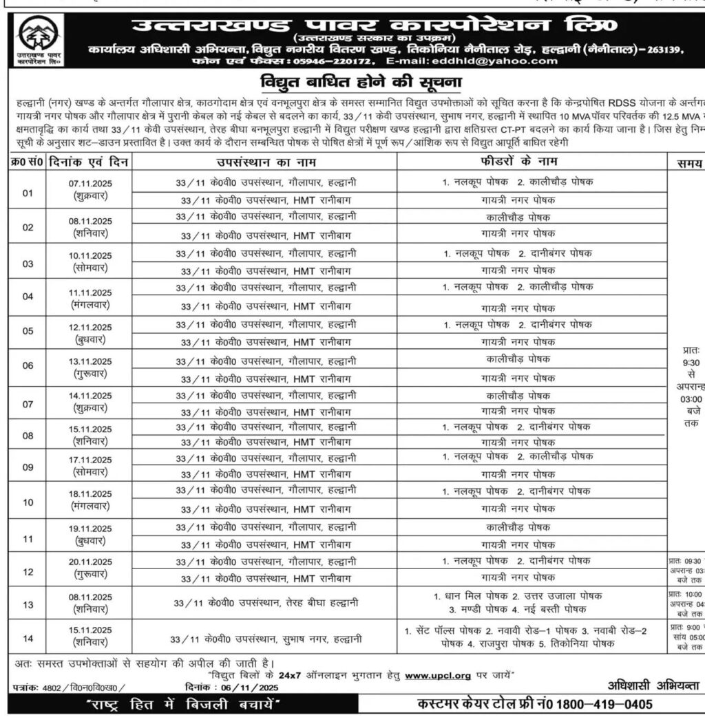 हल्द्वानी (नगर) खण्ड के अन्तर्गत गौलापार क्षेत्र, काठगोदाम क्षेत्र एवं वनभूलपुरा क्षेत्र के समस्त सम्मानित विद्युत उपभोक्ताओं को सूचित करना है कि केन्द्रपोषित RDSS योजना के अन्र्तग