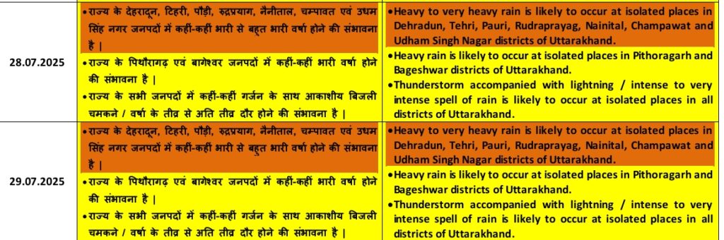 28 जुलाई को इन जिलों में भारी से बहुत भारी बारिश का खतरा: देहरादून, टिहरी, पौड़ी, रुद्रप्रयाग, नैनीताल, चम्पावत, उधम सिंह नगर, इन जनपदों में कहीं-कहीं बहुत भारी वर्षा हो सकती है, जिससे भूस्खलन, सड़कों के अवरुद्ध होने और नदियों-नालों में जलस्तर बढ़ने जैसी परिस्थितियां बन सकती हैं। वहीं, पिथौरागढ़ और बागेश्वर जिलों में भी कहीं-कहीं भारी वर्षा की संभावना जताई गई है।
