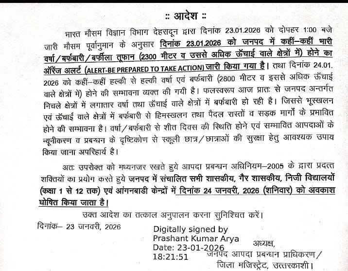 उत्तरकाशी में मौसम अलर्ट के चलते 24 जनवरी को जनपद में कक्षा 1–12 तक सभी विद्यालयों व आंगनबाड़ी केंद्रों में अवकाश घोषित