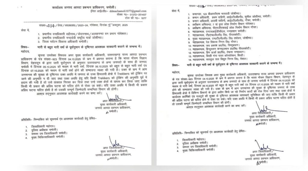 चमोली- भारतीय मौसम विभाग द्वारा प्राप्त पूर्वानुमान के अनुसार 05 से 07 अक्टूबर, 2025 तक जनपद चमोली सहित प्रदेश के अन्य जनपदों में भारी से बहुत भारी वर्षा होने की संभावना है। जिसे देखते हुये जिला प्रशासन द्वारा उच्च हिमालयी क्षेत्रों ट्रेकिंग गतिविधियों पर रोक लगाने के साथ साथ सभी विभागों एवं कार्यदायी संस्थाओं को जोखिम वाली जगहों पर मजदूरों से कराये जा रहें निर्माण कार्य पर रोक लगाने के निर्देश दिए गए हैं। साथ ही पूर्व में दी गई ट्रेकिंग अनुमतियाँ तत्काल प्रभाव से निरस्त कर दी गई हैं।