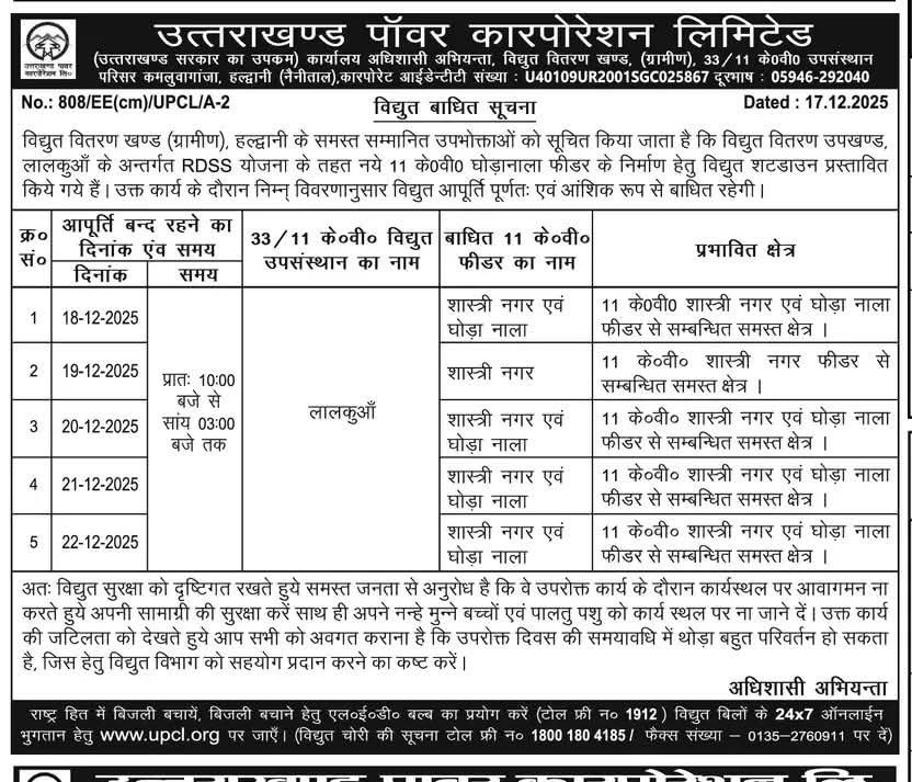 बिंदुखत्ता वालों आपके यहां 18 दिसंबर से लेकर 22 दिसंबर तक सुबह 10:00 से 3:00 बजे तक गुल रहेगी बिजली