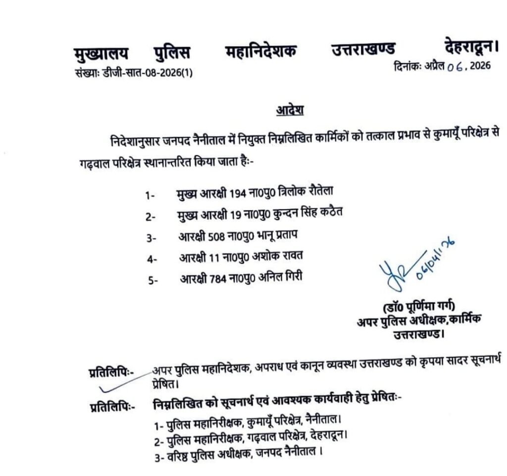 पुलिस मुख्यालय के निर्देश पर अपर पुलिस अधीक्षक कार्मिक पूर्णिमा गर्ग ने जारी किया पांचों का ट्रांसफर आदेश।