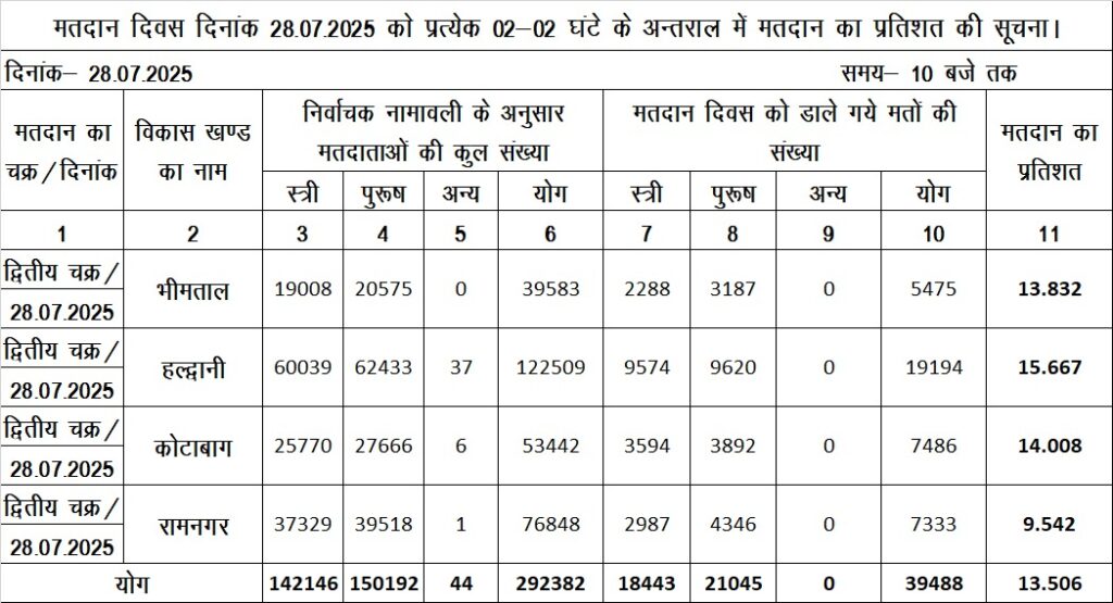 नैनीताल जिले के चार विकास खंडों में अब तक 13% मतदान हुआ है