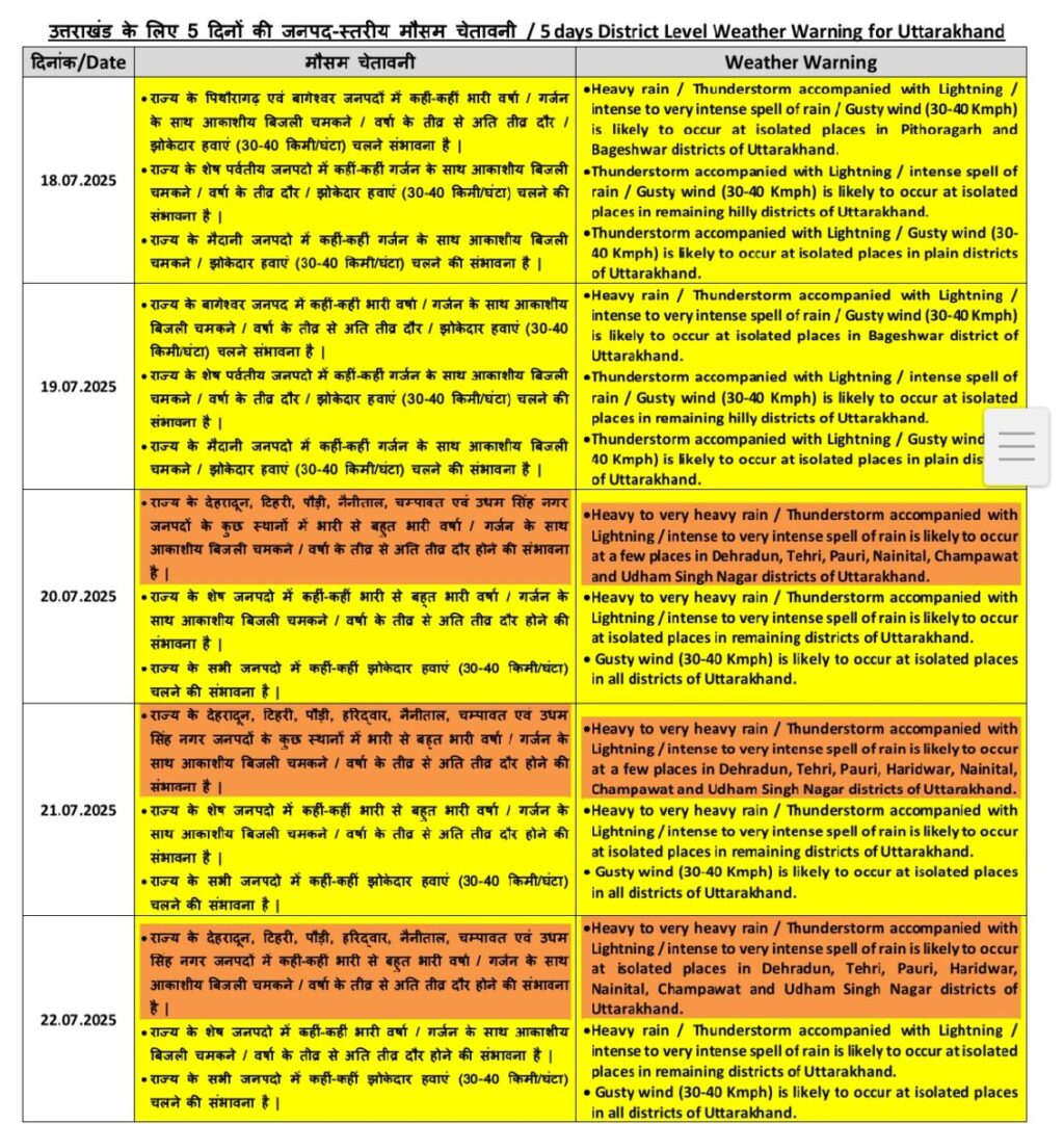 भारत मौसम विभाग, देहरादून, उत्तराखण्ड द्वारा दिनाँक 18 जुलाई, 2025 को प्रातः 09:00 बजे के मौसम पूर्वानुमान से सम्बन्धित प्राप्त सूचना के अनुसार जनपद में दिनांक 20, 21 एवं 22 जुलाई, 2025 को अनेक स्थानों पर भारी से बहुत भारी वर्षा ऑरेंज एलर्ट की चेतावनी जारी की गयी है जिसमें जनपद अन्तर्गत गर्जन के साथ आकाशीय बिजली चमकने एवं वर्षा के अति तीव्र दौर होने की सम्भावना व्यक्त की गई है (०) अतः मौसम विभाग द्वारा जारी चेतावनी के दृष्टिगत इस अवधि में जनपद के नगरीय एवं ग्रामीण क्षेत्रों में होने वाली घटनाओं से तत्परता से निपटने हेतु जनपद के समस्त अधिकारी अलर्ट पर रहेगें तथा क्षेत्रो में तैनात अधीनस्थ समस्त कार्मिकों/ संसाधनों को भी अलर्ट पर रखेंगे (०) विशेषकर भूस्खलन होने एवं पेड़ों के गिरने से मोटर मार्गों में मलुवा आने से यातायात बाधित होने के दृष्टिगत मलुवा तथा गिरे पेड़ो के त्वरित निस्तारण के साथ सर्तकता बनाए रखने हेतु अलर्ट पर रखेंगे (०) लोक निर्माण विभाग के समस्त खण्डों द्वारा संवेदनशील मोटर मार्गो / स्थानों पर उक्त अवधि में जे०सी०बी० मशीन एवं गैग कार्मिकों की तैनाती 24×7 सुनिश्चित की जाए (.) समस्त जिला/परगना/विकास खण्ड एवं सम्बन्धित क्षेत्र के अधिकारी अपने-अपने कार्य मुख्यालय पर बने रहेगें, अधिकारी/कर्मचारी अपने मोबाईल फोन ऑन (ON) रखेगें तथा प्रत्येक घण्टे आपदा क्षति सम्बन्धित सूचना तहसील कन्ट्रोल रूम एवं जिला आपातकालीन परिचालन केन्द्र के दूरभाष संख्या 05942-231178/79/81 एवं मो० नं0 8433092458 तथा टॉल फ्री नं 1077 पर आवश्यक रूप से उपलब्ध करायेगे (1)