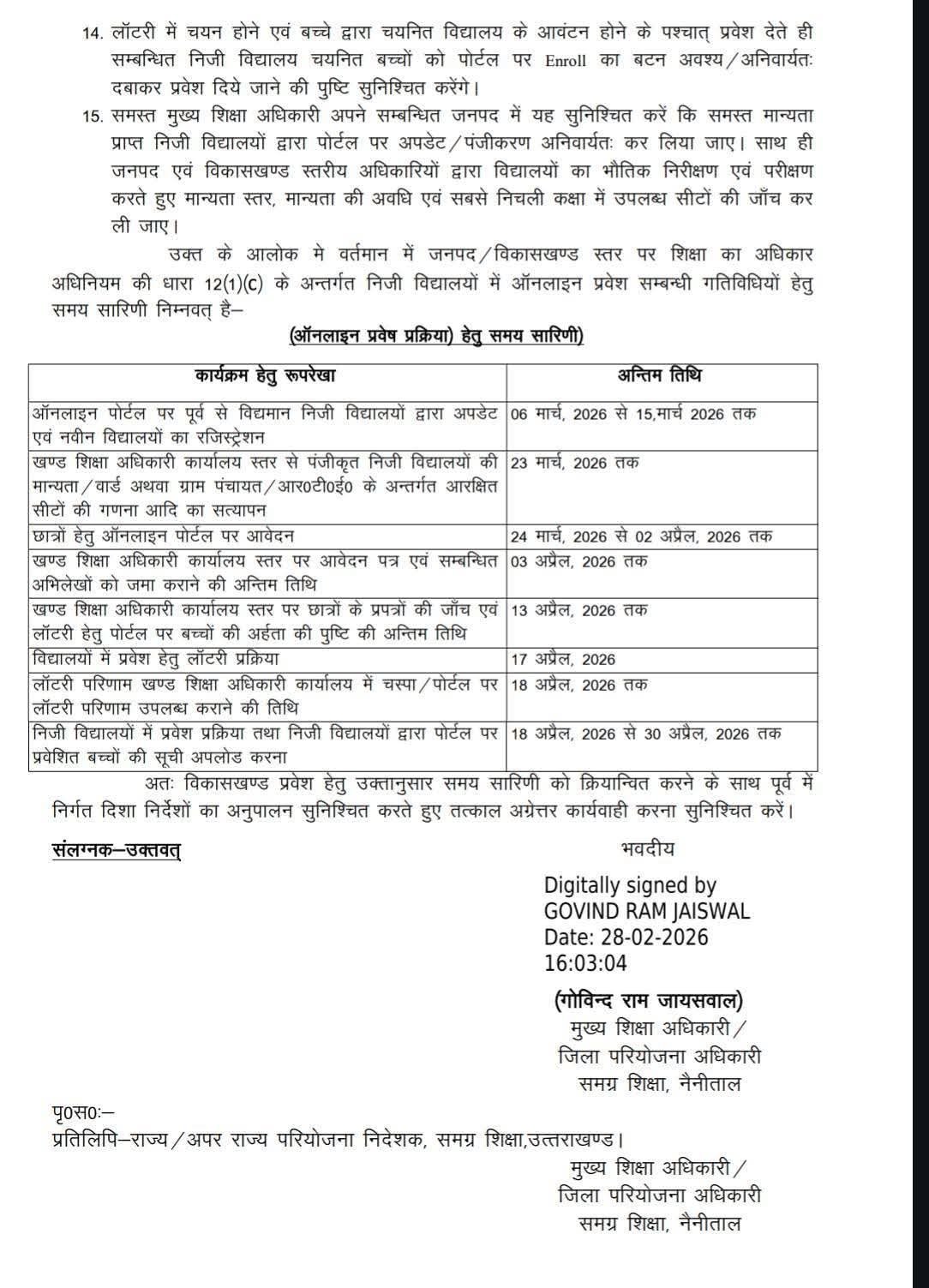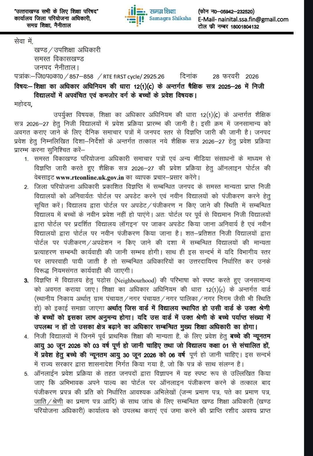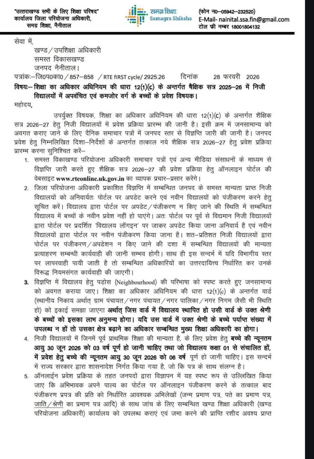 शिक्षा का अधिकार अधिनियम की धारा 12 (1) (C) के अन्तर्गत शैक्षिक सत्र 2026-27 हेतु निजी विद्यालयों में प्रवेश प्रक्रिया प्रारम्भ की जानी है। इसी क्रम में जनसामान्य को अवगत कराए जाने के लिए दैनिक समाचार पत्रों में जनपद स्तर से विज्ञप्ति जारी की जानी है। जनपद प्रवेश हेतु निम्नलिखित दिशा-