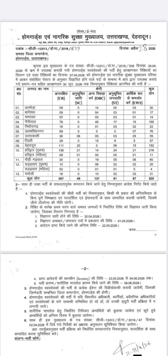 उत्तराखण्ड में होमगार्ड्स स्वयं सेवक की भर्ती हेतु जारी विज्ञप्ति।