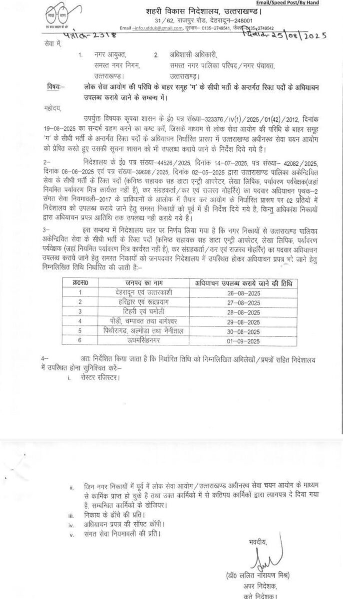 2-निदेशालय के ई० पत्र संख्या-44526/2025, दिनांक 14-07-2025, पत्र संख्या 42082/2025, दिनांक 06-06-2025 एवं पत्र संख्या-39698/2025, दिनांक 02-05-2025 द्वारा उत्तराखण्ड पालिका अकेन्द्रियित सेवा के सीधी भर्ती के रिक्त पदों (कनिष्ठ सहायक सह डाटा एन्ट्री आपरेटर, लेखा लिपिक, पर्यावरण पर्यवेक्षक (जहां नियमित पर्यावरण मित्र कार्यरत नहीं है), कर संग्रहकर्ता/कर एवं राजस्व मोहर्रिर) का पदवार अधियाचन पृथक-2 संगत सेवा नियमावली-2017 के प्राविधानों के आलोक में तैयार कर आयोग के निर्धारित प्रारूप पर 02 प्रतियों में निदेशालय को उपलब्ध कराये जाने हेतु समस्त निकायों को पूर्व में ही निर्देश दिये गये है, किन्तु अधिकांश निकायों द्वारा अधियाचन प्रपत्र आतिथि तक उपलब्ध नहीं कराये गये है।