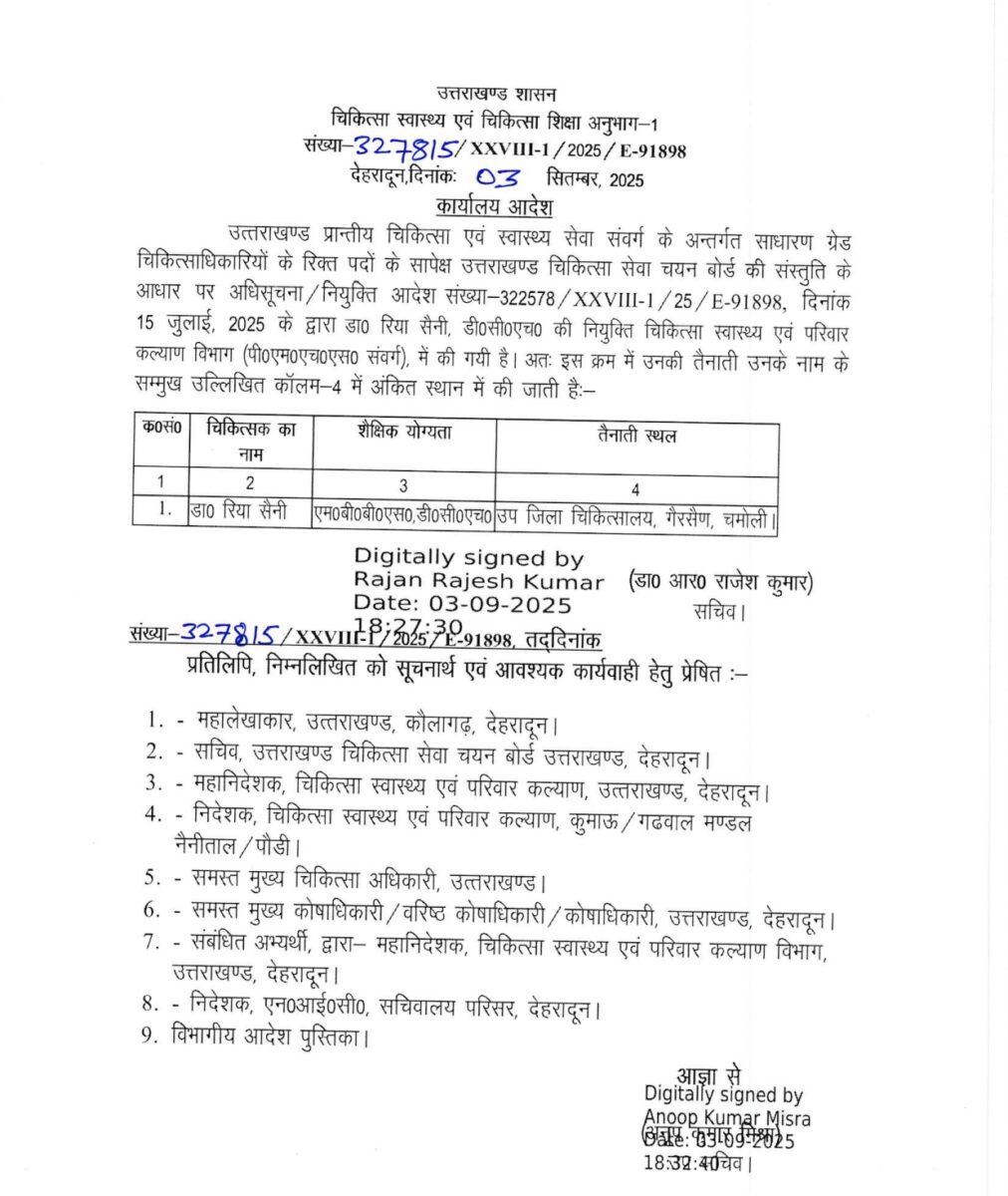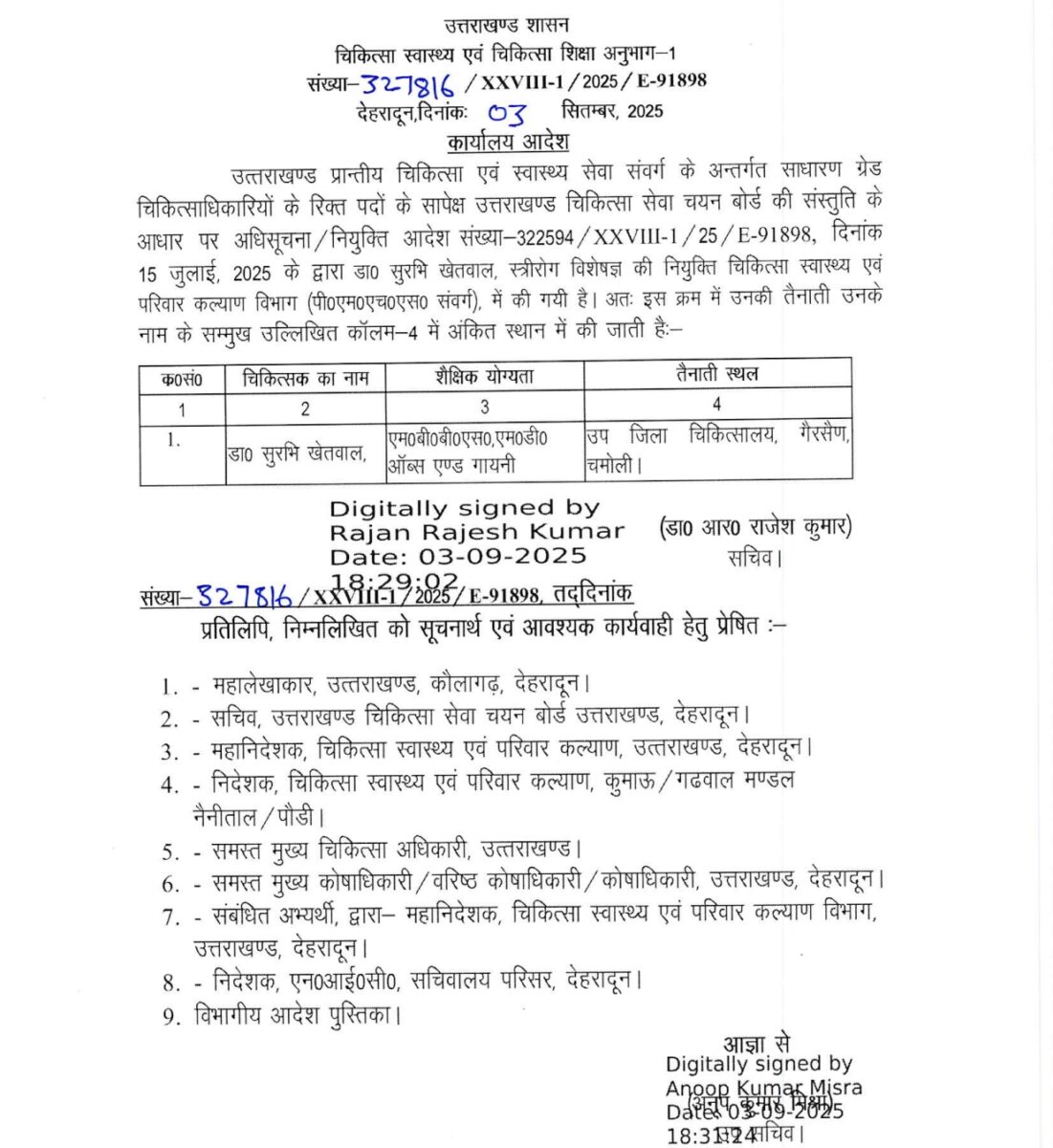 उत्तराखण्ड प्रान्तीय चिकित्सा एवं स्वास्थ्य सेवा संवर्ग के अन्तर्गत साधारण ग्रेड चिकित्साधिकारियों के रिक्त पदों के सापेक्ष उत्तराखण्ड चिकित्सा सेवा चयन बोर्ड की संस्तुति के आधार पर अधिसूचना/नियुक्ति आदेश संख्या-322594/XXVIII-1/25/E-91898, दिनांक 15 जुलाई, 2025 के द्वारा डा० सुरभि खेतवाल, स्त्रीरोग विशेषज्ञ की नियुक्ति चिकित्सा स्वास्थ्य एवं परिवार कल्याण विभाग (पी०एम०एच०एस० संवर्ग), में की गयी है। अतः इस क्रम में उनकी तैनाती उनके नाम के सम्मुख उल्लिखित कॉलम-4 में अंकित स्थान में की जाती है:-