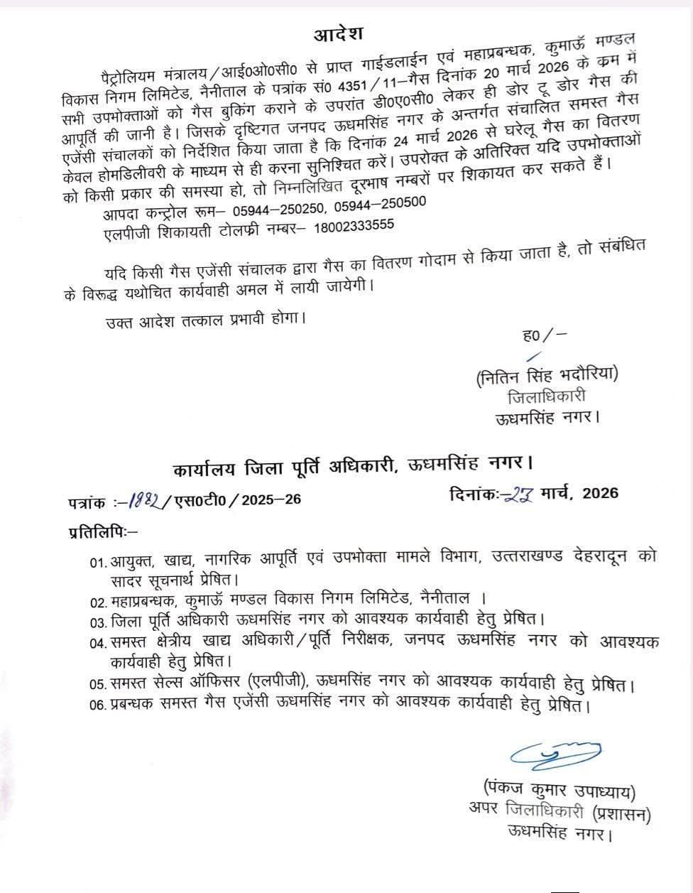 पैट्रोलियम मंत्रालय / आई०ओ०सी० से प्राप्त गाईडलाईन एवं महाप्रबन्धक, कुमाऊँ मण्डल विकास निगम लिमिटेड, नैनीताल के पत्रांक सं0 4351/11-गैस दिनांक 20 मार्च 2026 के कम में सभी उपभोक्ताओं को गैस बुकिंग कराने के उपरांत डी०ए०सी० लेकर ही डोर टू डोर गैस की आपूर्ति की जानी है। जिसके दृष्टिगत जनपद ऊधमसिंह नगर के अन्तर्गत संचालित समस्त गैस एजेंसी संचालकों को निर्देशित किया जाता है कि दिनांक 24 मार्च 2026 से घरेलू गैस का वितरण केवल होमडिलीवरी के माध्यम से ही करना सुनिश्चित करें। उपरोक्त के अतिरिक्त यदि उपभोक्ताओं को किसी प्रकार की समस्या हो, तो निम्नलिखित दूरभाष नम्बरों पर शिकायत कर सकते हैं।