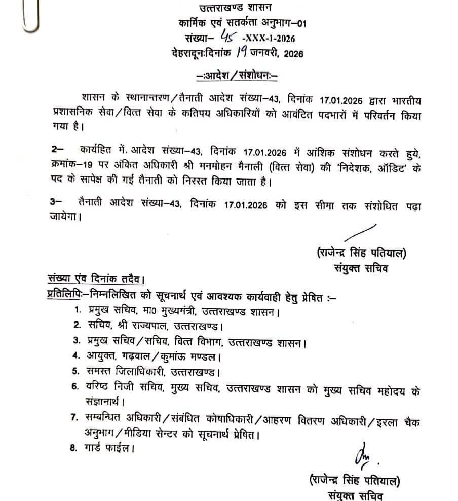 देहरादून: 36 घंटे से कम वक्त में ही वापस हो गए मनमोहन मैनाली !निदेशक ऑडिट के पद से मनमोहन मैनाली को हटाया गया, बड़ी खबर, आईएएस की जगह दी गई थी तैनाती, हुआ था विरोध, पोस्टिंग होते ही मैनाली पर उठने लगे थे सवाल, अब कार्मिक विभाग ने जारी किया ये आदेश।