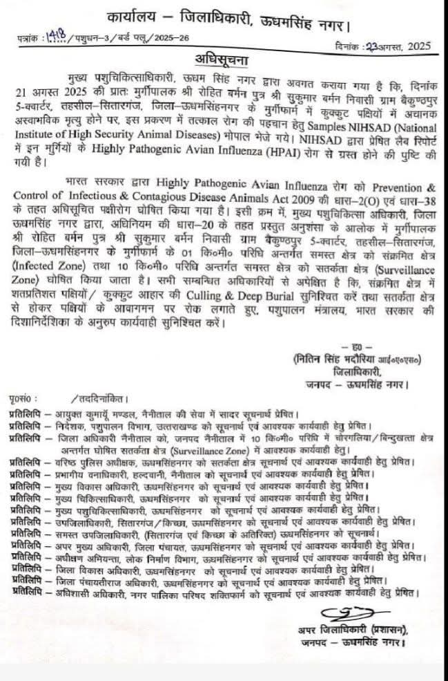 इन मुर्गियों में एचपीएआई (HPAI) रोग से ग्रसित होने की पुष्टि की गई है।