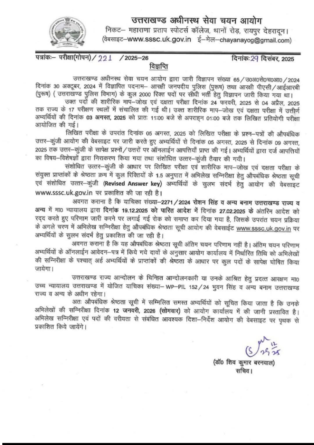अवगत कराना है कि याचिका संख्या-2271/2024 रोशन सिंह व अन्य बनाम उत्तराखण्ड राज्य व अन्य में मा० न्यायालय द्वारा दिनांक 19.12.2025 को पारित आदेश में दिनांक 27.02.2025 के अंतरिम आदेश को रद्द करते हुए परिणाम जारी करने पर लगाई गई रोक को समाप्त कर दिया गया है, जिसके उपरांत चयन प्रक्रिया के अगले चरण में अभिलेख सन्निरीक्षा हेतु औपबंधिक श्रेष्ठता सूची आयोग की वेबसाईट www.sssc.uk.gov.in पर अभ्यर्थियों के सुलभ संदर्भ हेतु प्रकाशित की जा रही है।