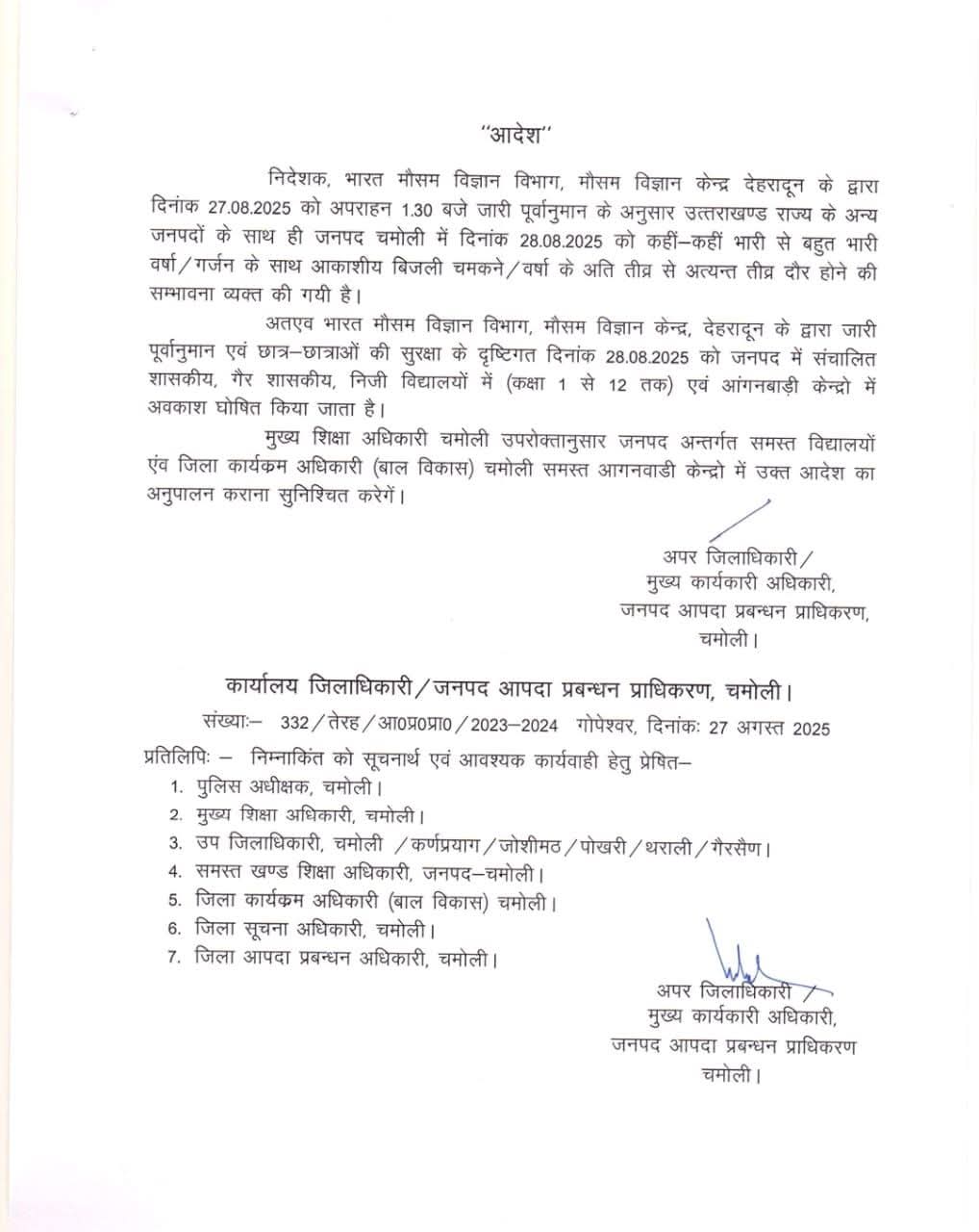 चमोली- उत्तराखंड में मौसम विभाग की भारी बारिश के अलर्ट को देखते हुए कल 28 अगस्त को चमोली जनपद के सभी विद्यालयों में रहेगा अवकाश, आदेश हुए जारी