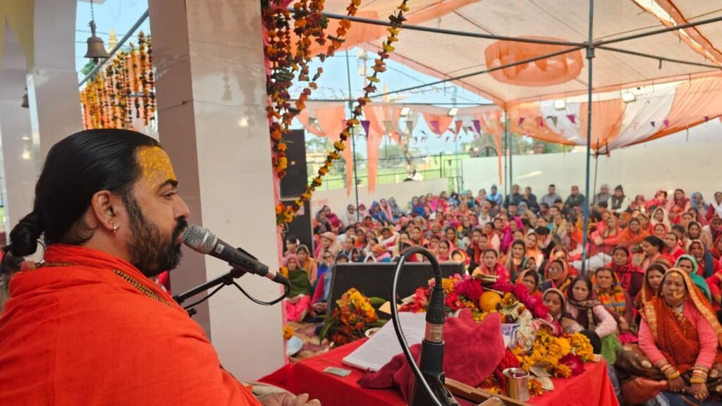 उन्होंने अपने प्रवचनों में भगवान के हयग्रीव अवतार की कथा का विस्तार से वर्णन किया और देवी महिमा का भावपूर्ण वर्णन करते हुए बताया कि भक्ति और मंत्र शक्ति से मन, बुद्धि और आत्मा का शुद्धिकरण संभव है। कथा के दौरान मंदिर परिसर भक्तिरस में डूबा रहा और बड़ी संख्या में श्रद्धालु भाव-विभोर होकर कथा श्रवण करते रहे।