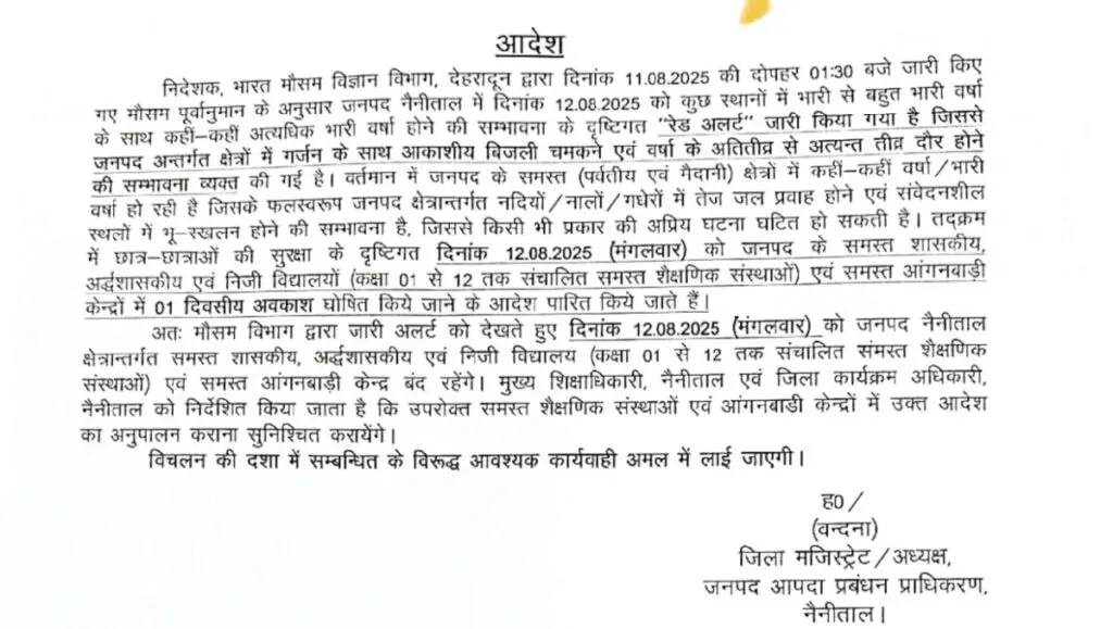 निदेशक, भारत मौसम विज्ञान विभाग, देहरादून द्वारा दिनांक 11.08.2025 की दोपहर 01:30 बजे जारी किए गए मौसम पूर्वानुमान के अनुसार जनपद नैनीताल में दिनांक 12.08.2025 को कुछ स्थानों में भारी से बहुत भारी वर्षा के साथ कहीं-कहीं अत्यधिक भारी वर्षा होने की सम्भावना के दृष्टिगत “रेड अलर्ट” जारी किया गया है जिससे जनपद अन्तर्गत क्षेत्रों में गर्जन के साथ आकाशीय बिजली चमकने एवं वर्षा के अतितीव्र से अत्यन्त तीव्र दौर होने की सम्भावना व्यक्त की गई है। वर्तमान में जनपद के समस्त (पर्वतीय एवं मैदानी) क्षेत्रों में कहीं-कहीं वर्षा/भारी वर्षा हो रही है जिसके फलस्वरूप जनपद क्षेत्रान्तर्गत नदियों/ नालों / गधेरों में तेज जल प्रवाह होने एवं संवेदनशील स्थलों में भू-स्खलन होने की सम्भावना है, जिससे किसी भी प्रकार की अप्रिय घटना घटित हो सकती है। तक्रम में छात्र-छात्राओं की सुरक्षा के दृष्टिगत दिनांक 12.08.2025 (मंगलवार) को जनपद के समस्त शासकीय, अर्द्धशासकीय एवं निजी विद्यालयों (कक्षा 01 से 12 तक संचालित समस्त शैक्षणिक संस्थाओं) एवं समस्त आंगनबाड़ी केन्द्रों में 01 दिवसीय अवकाश घोषित किये जाने के आदेश पारित किये जाते हैं।