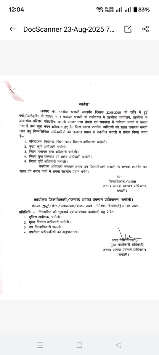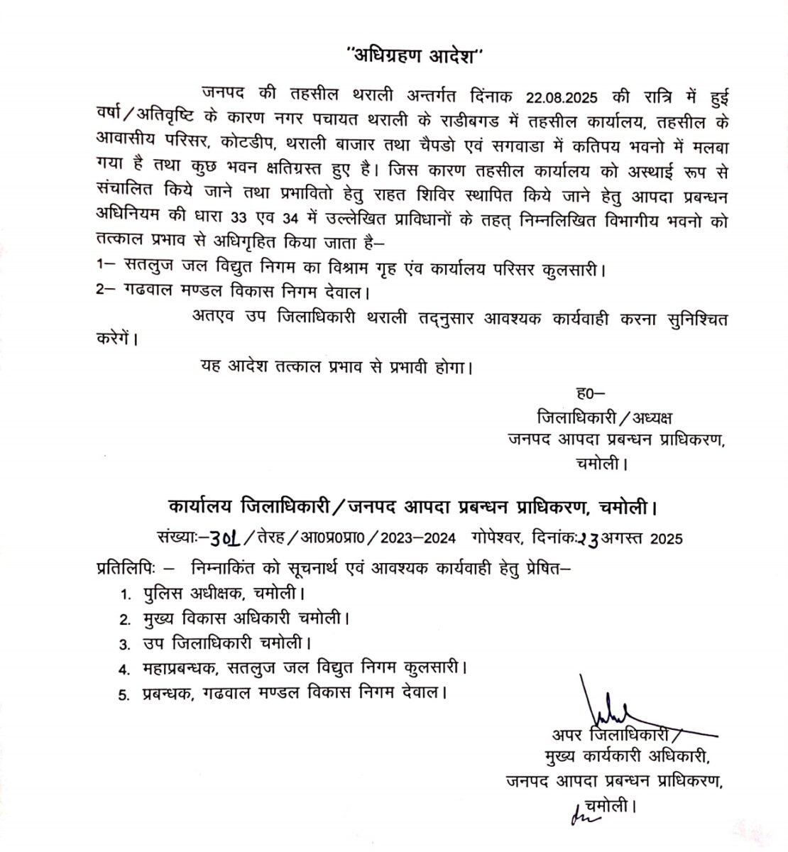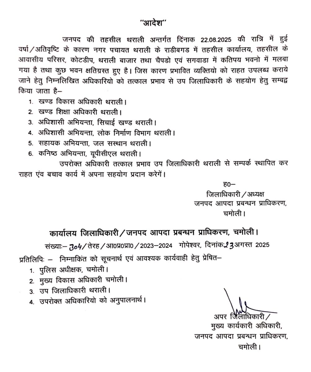 बता दें कि थराली तहसील क्षेत्र के टूनरी गदेरे में शुक्रवार देर रात बादल फटने से थराली बाजार और आसपास के क्षेत्र में भारी मलबा आ गया। मलबे की चपेट में आने से एसडीएम आवास सहित कई मकान क्षतिग्रस्त हो गए। दुकानों में मलबा भर गया। कई वाहन भी मलबे में दब गए। सूचना मिलते ही राहत और बचाव कार्य के लिए डीडीआरएफ की टीम मौके पर पहुंच चुकी है। वहीं एसडीआरएफ और एनडीआरफ की टीम आपदा क्षेत्र के लिए रवाना हो गई है। कर्णप्रयाग ग्वालदम सड़क को भारी बारिश के चलते कई स्थानों पर क्षतिग्रस्त हो गई है। जिसे सुचारू करने का कार्य प्राथमिकता के आधार पर किया जा रहा है।