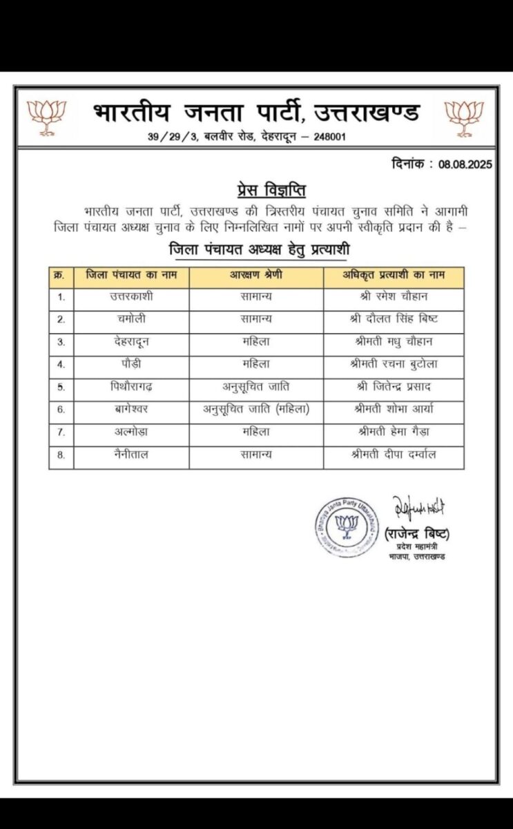 भाजपा ने जारी की 8 जिला पंचायत अध्यक्ष प्रत्याशियों की लिस्ट नैनीताल जिले से दीपा दरमवाल को बनाया प्रत्याशी