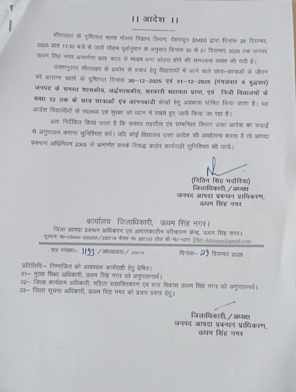 शीतलहर के दृष्टिगत भारत मौसम विज्ञान विभाग, देहरादून (IMD) द्वारा दिनांक 29 दिसम्बर, 2025 प्रात 11:30 बजे से जारी मौसम पूर्वानुमान के अनुसार दिनांक 30 से 31 दिसम्बर, 2025 तक जनपद ऊधम सिंह नगर अन्तर्गन्त प्रातः काल से मध्यम घना कोहरा होने की सम्भावना व्यक्त की गयी है।