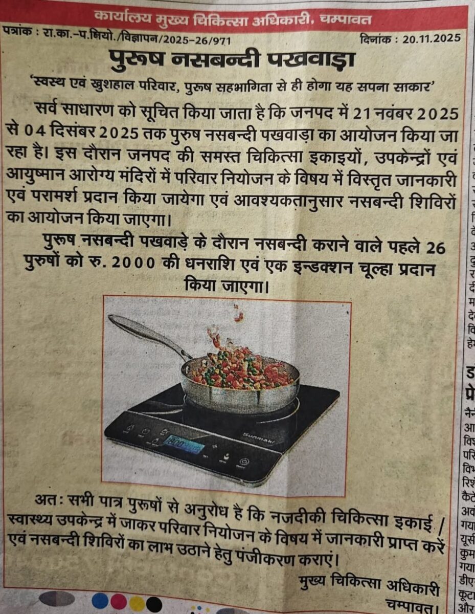 उत्तराखंड: स्वास्थ्य विभाग की योजना, पुरुष नसबंदी कराए, 2 हजार और इंडक्शन चूल्हा इनाम पाए