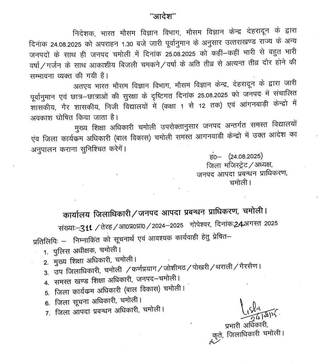 अतएव भारत मौसम विज्ञान विभाग, मौसम विज्ञान केन्द्र, देहरादून के द्वारा जारी पूर्वानुमान एवं छात्र-छात्राओं की सुरक्षा के दृष्टिगत दिनांक 25.08.2025 को जनपद में संचालित शासकीय, गैर शासकीय, निजी विद्यालयों में (कक्षा 1 से 12 तक) एवं आंगनबाड़ी केन्द्रो में अवकाश घोषित किया जाता है।