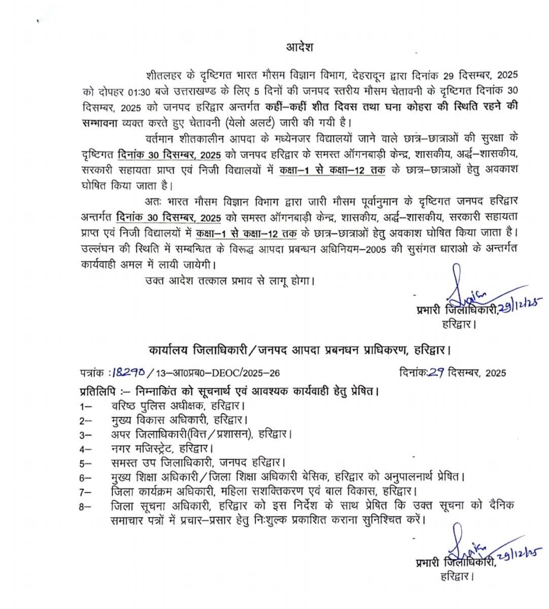 शीतलहर के दृष्टिगत नर्सरी से कक्षा 12 तक तक समस्त विद्यालय कल बंद रहेंगे