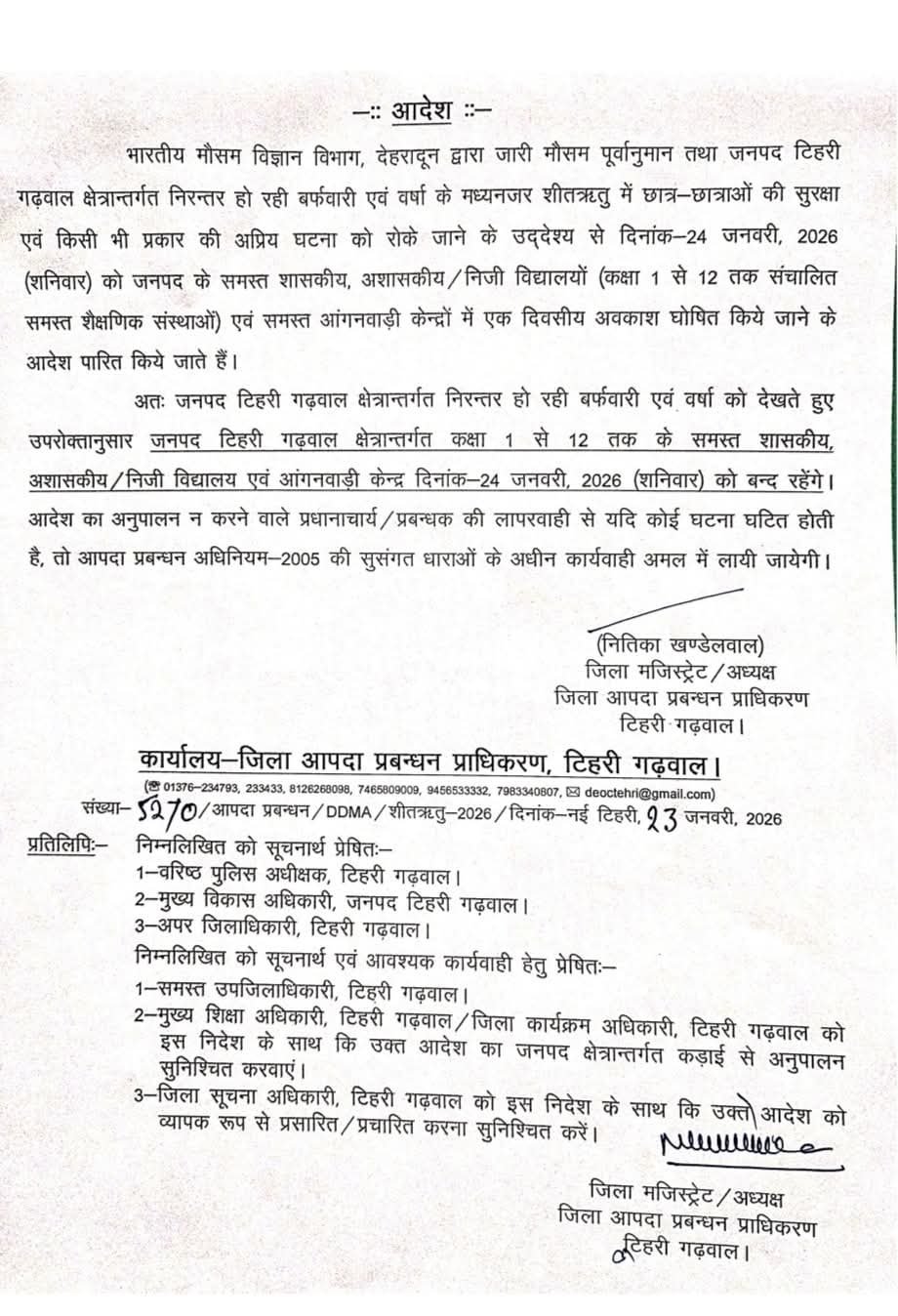 मौसम विभाग द्वारा जारी मौसम पूर्वानुमान के दृष्टिगत जनपद टिहरी गढ़वाल में दिनांक 24 जनवरी, 2026 (शनिवार) को समस्त शासकीय, अशासकीय/ निजी विद्यालयों (कक्षा 1 से 12 तक संचालित समस्त शैक्षणिक संस्थाओं) एवं समस्त आंगनवाड़ी केन्द्रों में अवकाश घोषित किया गया है।