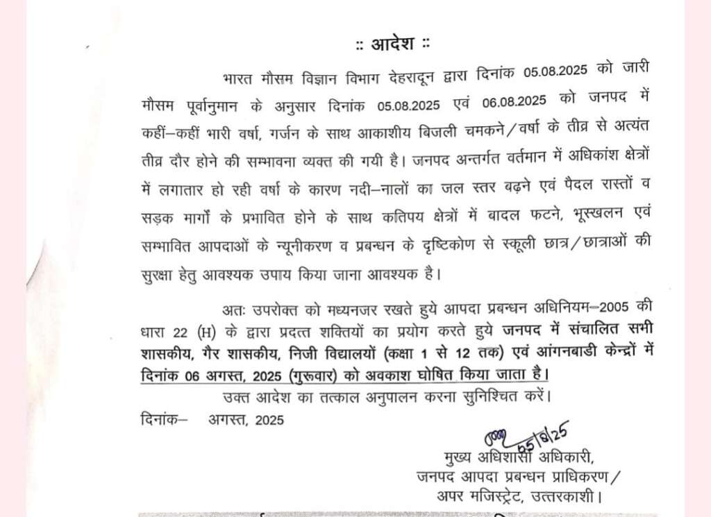 भारत मौसम विज्ञान विभाग देहरादून द्वारा दिनांक 05.08.2025 को जारी मौसम पूर्वानुमान के अनुसार दिनांक 05.08.2025 एवं 06.08.2025 को जनपद में कहीं-कहीं भारी वर्षा, गर्जन के साथ आकाशीय बिजली चमकने / वर्षा के तीव्र से अत्यंत तीव्र दौर होने की सम्भावना व्यक्त की गयी है। जनपद अन्तर्गत वर्तमान में अधिकांश क्षेत्रों में लगातार हो रही वर्षा के कारण नदी-नालों का जल स्तर बढ़ने एवं पैदल रास्तों व सड़क मार्गों के प्रभावित होने के साथ कतिपय क्षेत्रों में बादल फटने, भूस्खलन एवं सम्भावित आपदाओं के न्यूनीकरण व प्रबन्धन के दृष्टिकोण से स्कूली छात्र/छात्राओं की सुरक्षा हेतु आवश्यक उपाय किया जाना आवश्यक है।