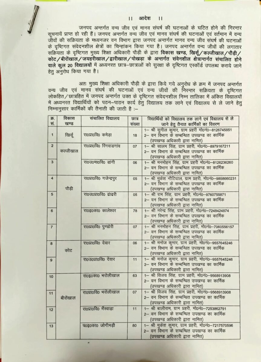 अतः मुख्य शिक्षा अधिकारी पौड़ी के द्वारा किये गये अनुरोध के क्रम में जनपद अन्तर्गत वन्य जीव एवं मानव संघर्ष की घटनाओं एवं वन्य जीवों की निरन्तर सक्रियता के दृष्टिगत लोकहित / छात्रहित में जनपद अन्तर्गत उक्त के दृष्टिगत संवेदनशील निम्न तालिका में अंकित विद्यालयों में अध्यनरत विद्यार्थियों को पठन-पाठन कार्य हेतु विद्यालय तक लाने एवं विद्यालय से ले जाने हेतु निम्नानुसार कार्मिकों की तैनाती की जाती है :-