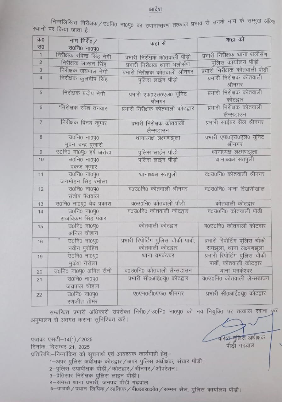 उत्तराखंड: एसएसपी पौड़ी ने किए ट्रांसफर, तेजतर्रार कुलदीप सिंह बने कोतवाल श्रीनगर, 22 तबादले