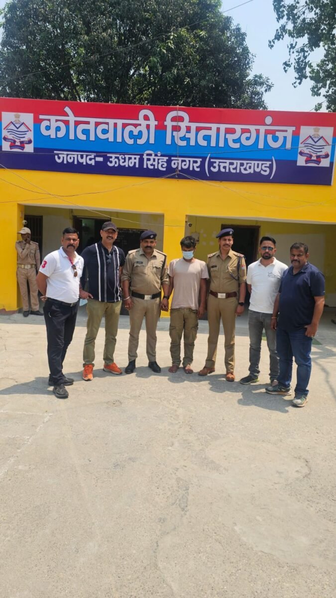 *गिरफ्तार अभियुक्त का विवरणः-*1. चेतन सिंह बिष्ट पुत्र नर सिंह बिष्ट निवासी चांदनी चौक घुडदौड़ा, कालीनगर, थाना हल्द्वानी जनपद नैनीताल उम्र 34 बर्ष*टीमः उत्तराखण्ड STF*1. निरीक्षक विकास चौधरी 2. उ0 नि0 विपिन चंद्र जोशी3. उ0नि0 कृष्ण गोपालमठपाल4. हे0 का0 महेन्द्र गिरी5. हे0 का0 किशोर कुमार6. कान्स. जीतेन्द्र कुमार7. किशन चंद्र शर्मा (टेक्निकल हैंड) *कोतवाली सितारगंज टीम* 1.व0उ0 नि0 राजेंद्र मुनियाल 2. का0 विनोद जोशी