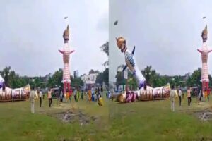 रुद्रपुर: उधम सिंह नगर जिले के रुद्रपुर में आज उस वक्त लोगों की सांसें अटक गईं जब दशहरा कार्यक्रम के केंद्र बने रावण, कुंभकरण और मेघनाद के विशाल पुतले दहन से पहले ही धराशायी हो गए। तेज हवा और अचानक आई बारिश ने पूरे आयोजन की व्यवस्था को हिला कर रख दिया। गांधी पार्क मैदान में कुछ ही सेकंड में धड़ाम से गिरे पुतलों को देख वहां मौजूद लोग सकते में आ गए। हालांकि, राहत की बात ये रही कि इस घटना में कोई हताहत नहीं हुआ।