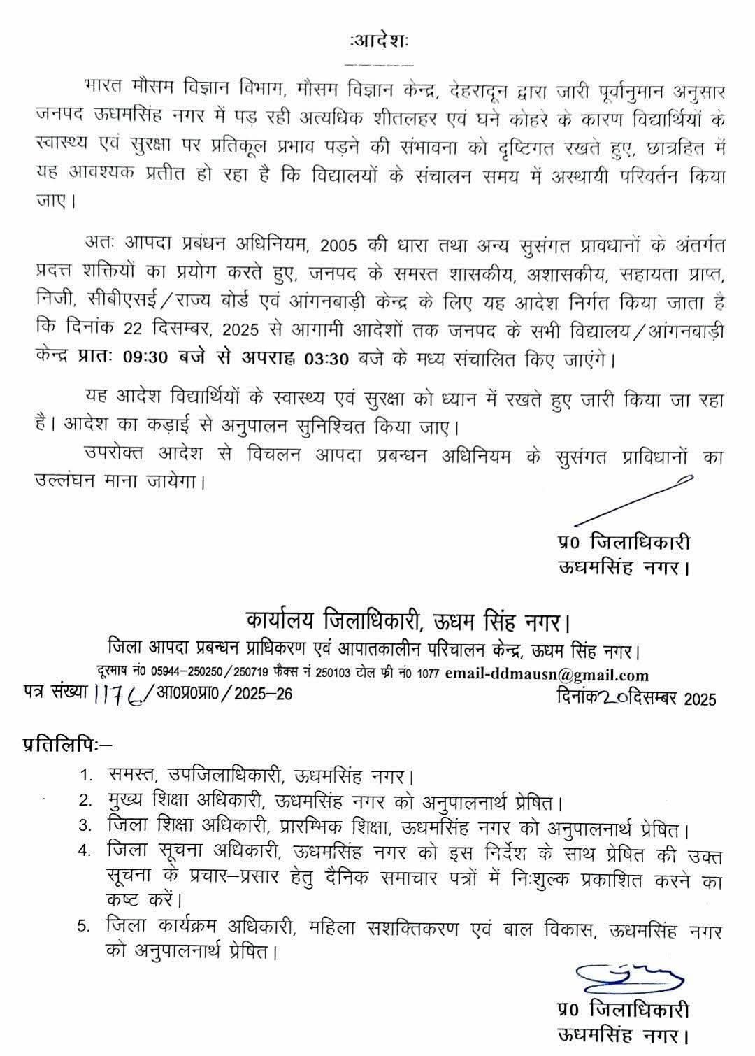 दिनांक 22 दिसम्बर, 2025 से आगामी आदेशों तक जनपद के सभी विद्यालय / आंगनबाड़ी केन्द्र प्रातः 09:30 बजे से अपराह्न् 03:30 बजे के मध्य संचालित किए जाएंगे।