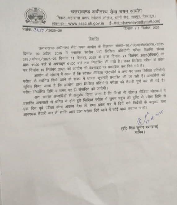 उत्तराखण्ड अधीनस्थ सेवा चयन आयोग के विज्ञापन संख्या-70/उ०अ०Йокото/2025 दिनांक 09 अप्रैल, 2025 में स्नातक स्तरीय पदों लिखित प्रतियोगी परीक्षा विज्ञप्ति संख्या 319/गोपन/2025-20 दिनांक 11 सितंबर, 2025 के द्वारा दिनांक 21 सितंबर, 2025 (रविवार) को प्रातः 11:00 बजे से अपराह्न 01:00 बजे तक निर्धारित की गयी है। उक्त लिखित परीक्षा के प्रवेश पत्र दिनांक 15 सितंबर, 2025 को आयोग की वेबसाइट पर प्रकाशित कर दिये गये हैं।